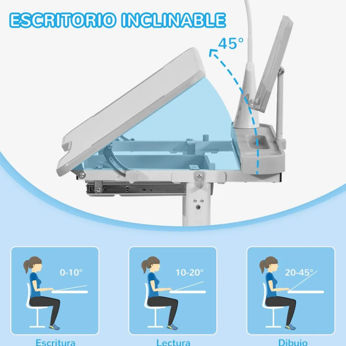 - La encimera de la mesa se puede inclinar hasta 45°, permitiendo que los niños mantengan una buena postura y no forzar la vista.