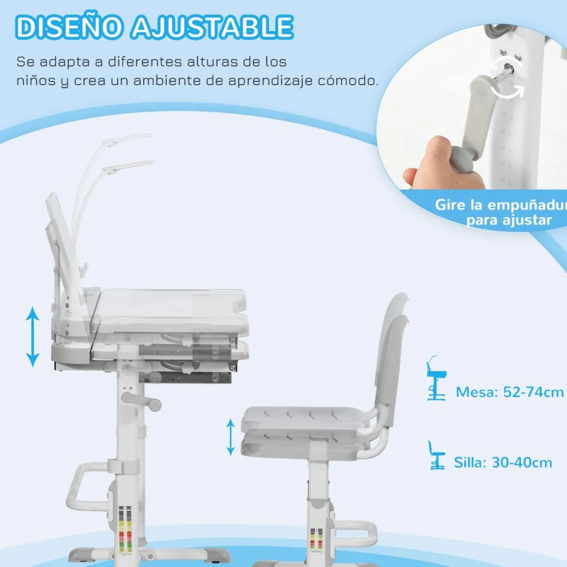 - Silla y mesa de escritorio para niños con altura regulable.