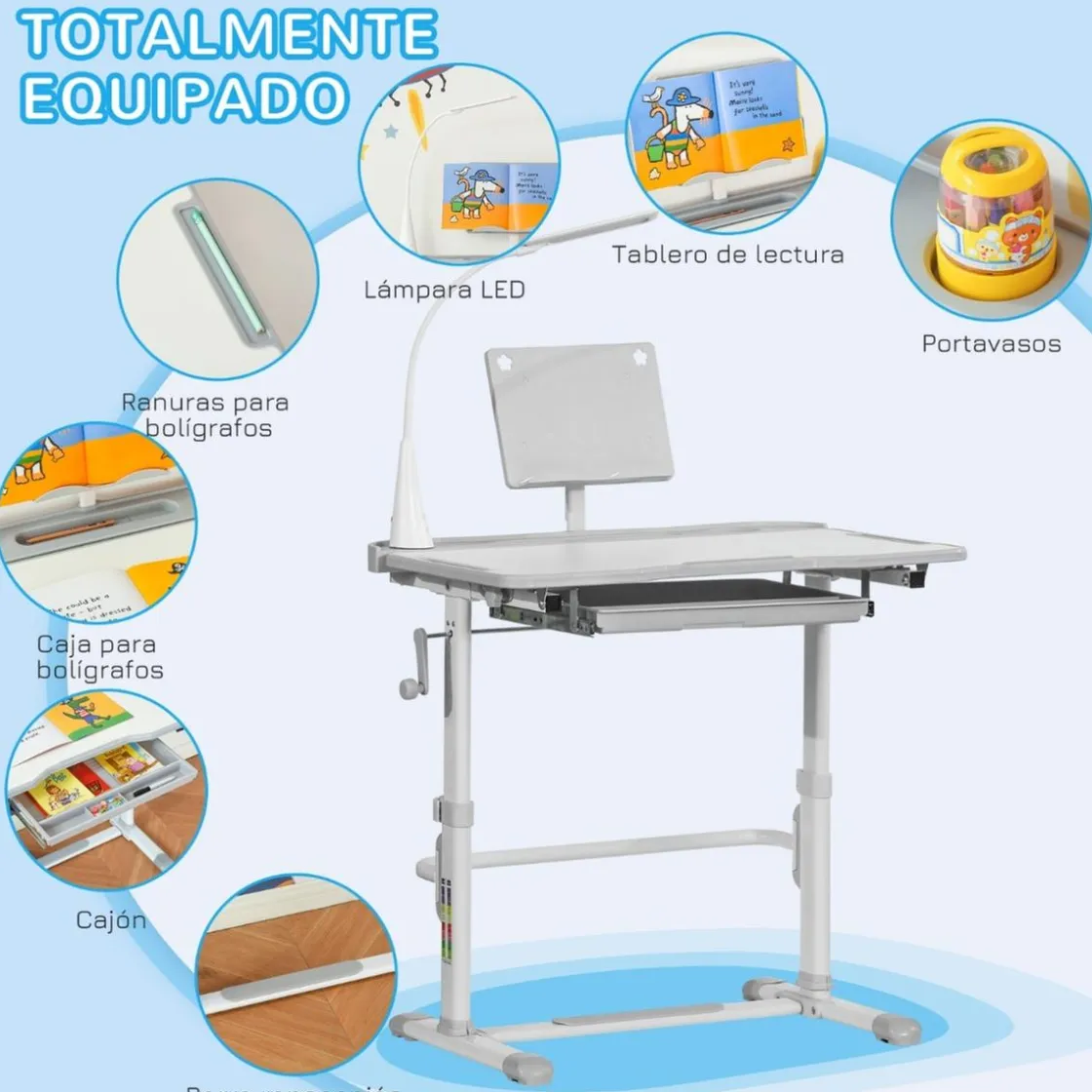 - El escritorio infantil incluye un cajón, 2 ranuras para bolígrafos, un portavasos, un tablero de lectura, una lámpara LED y un lapicero.