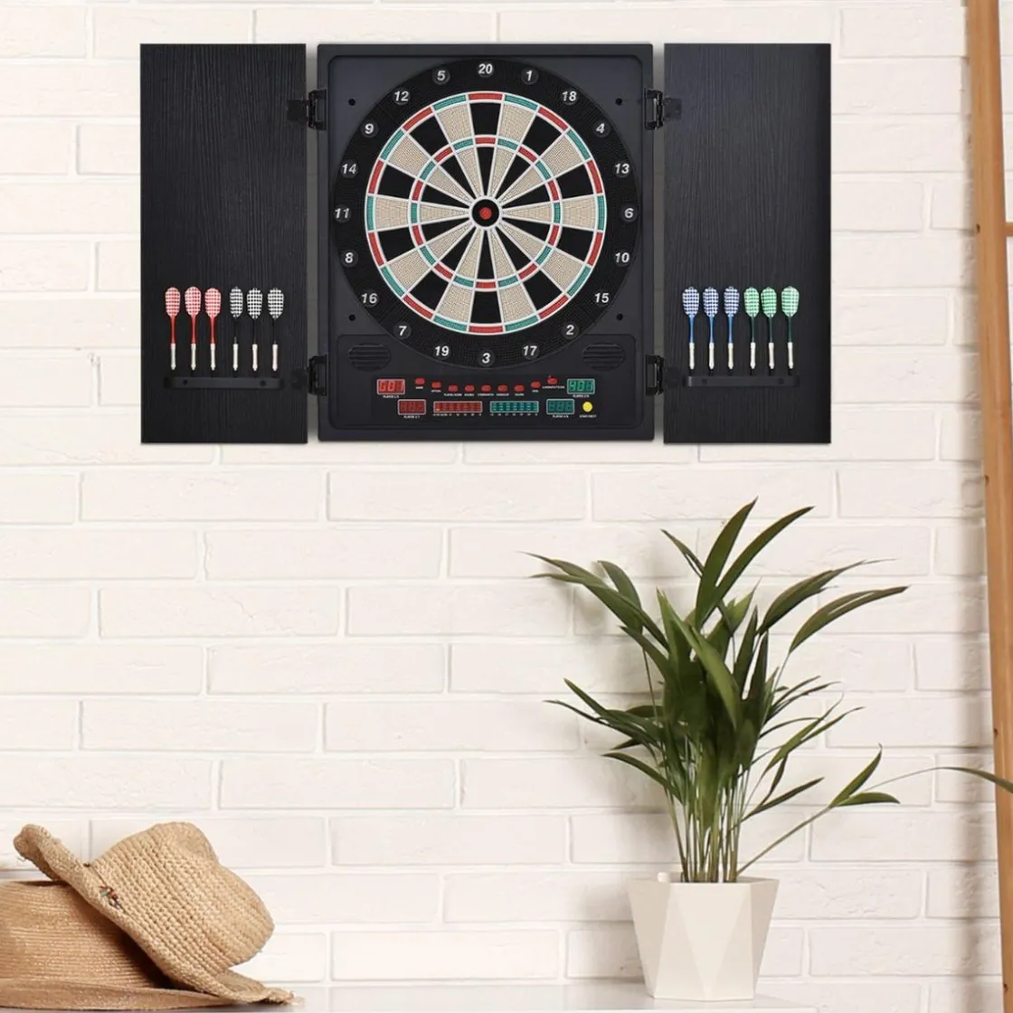 ¿Buscando un juego para disfrutar con familiares y amigos? La diana electrónica de Homcom con pantalla LED proporciona horas de diversión. Cuenta con tapa de madera que permite que almacenes tus dardos en ella y a la vez protege tu pared de los dardos cuando juegas. Tiene 27 juegos diferentes y 202 opciones de puntuación diferente e incluye 12 dardos y 30 puntas de recambio. Y si un día quieres jugar sólo también puedes hacerlo ¡O competir contra la máquina! Genial ¿verdad?