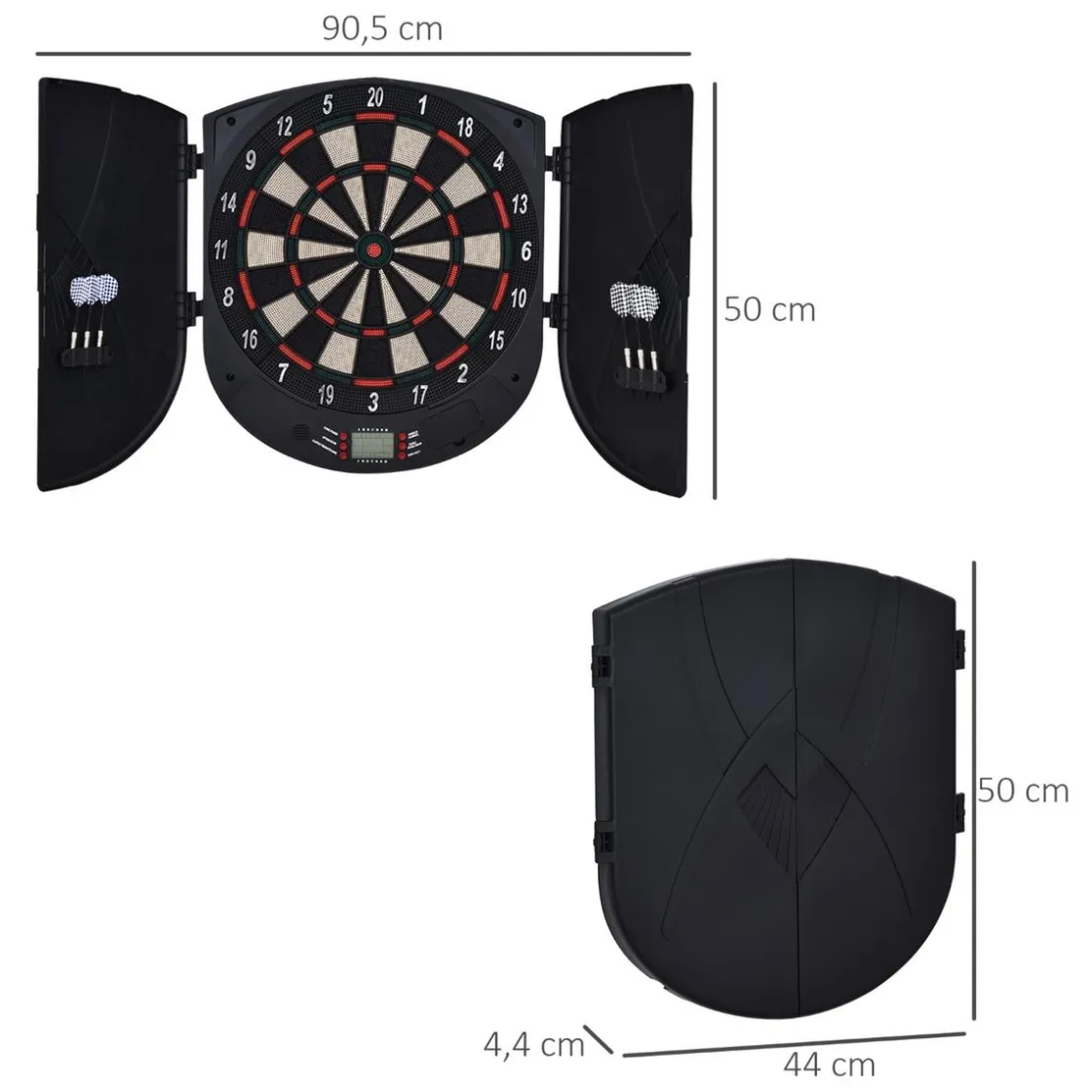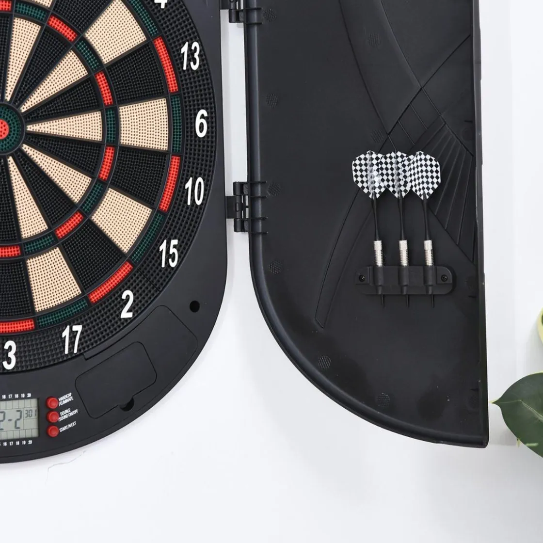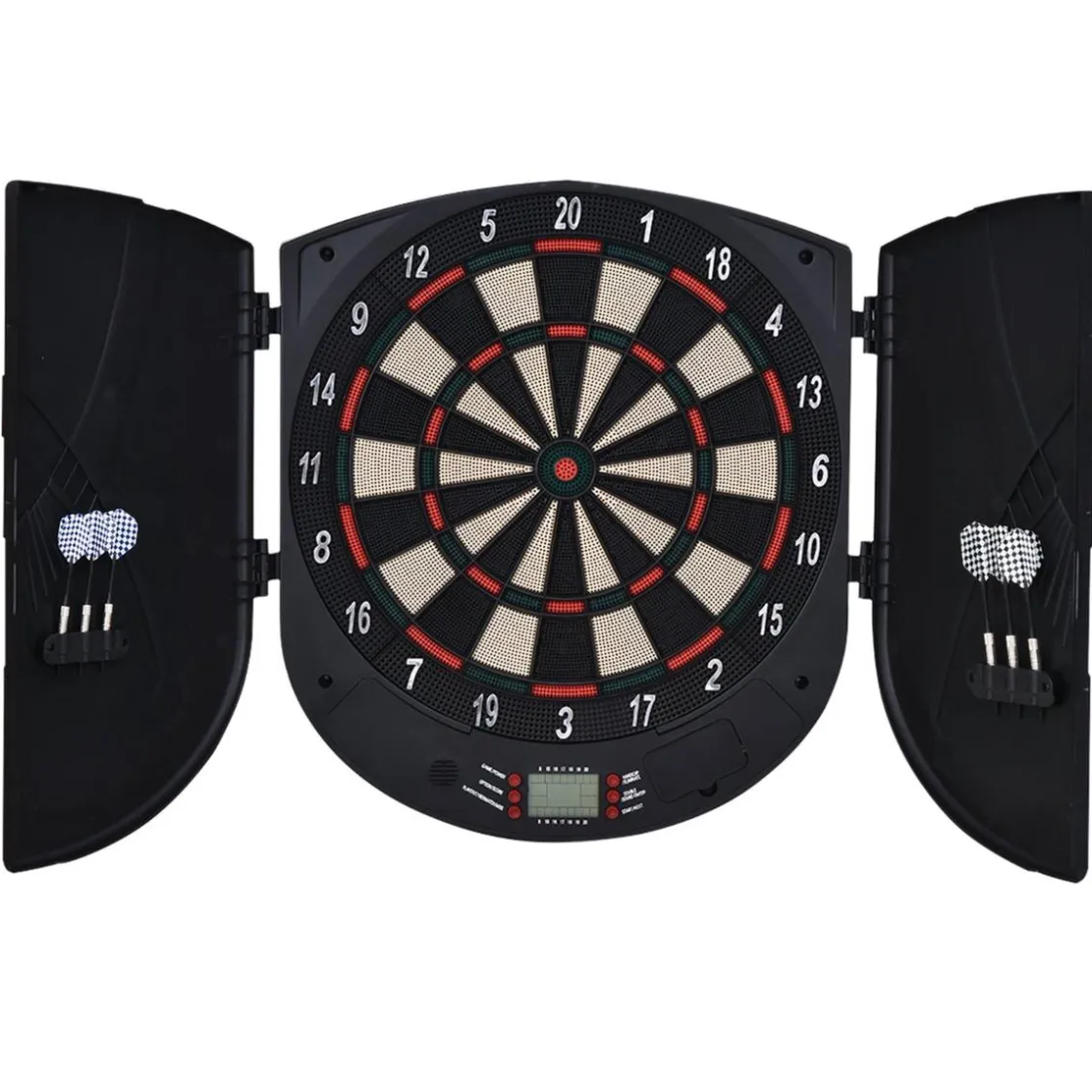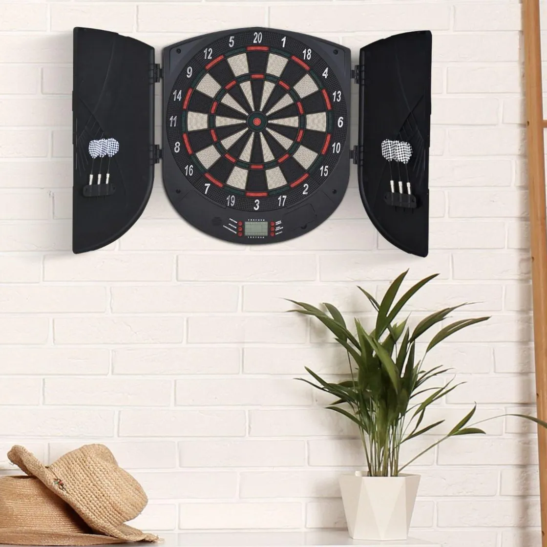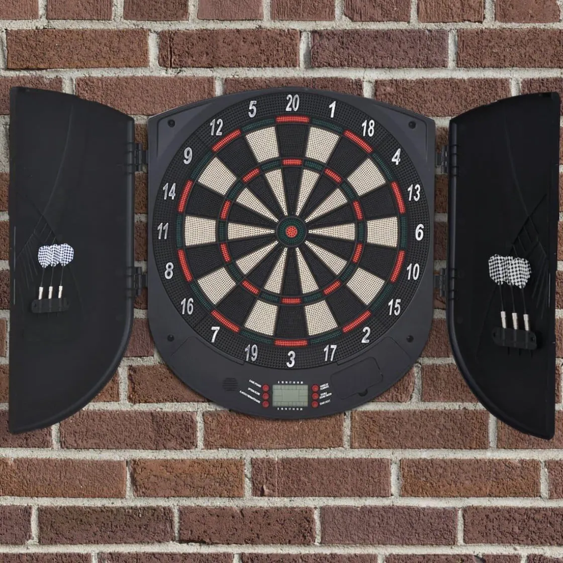 Viene con una pantalla LCD con marcador y para poder seguir la evolución del juego, hay 26 de diferentes. ¡Para jugar hasta 8 personas a la vez! Además, esta diana viene con dos puertas laterales que a la vez que sirven para almacenar los dardos y proteger la diana cuando no está en uso, una vez abiertas protegerán también la zona de juego para no dañar la pared. ¡Llévatela a casa y a ganar!