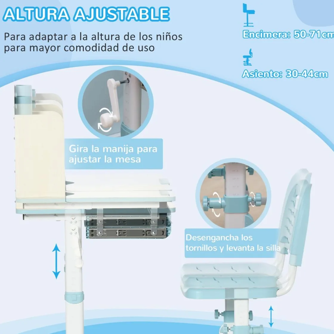 La altura de la mesa (50-71 cm) y la silla (30-44 cm) son ajustables para acompañar el crecimiento y las necesidades de los niños. Para ajustar la mesa, gira la manivela y la silla, solo afloja el tornillo y luego vuelve a apretarlo.