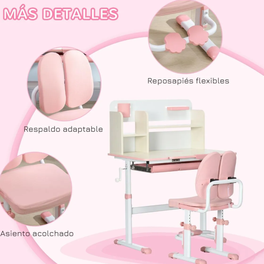 Homcom – Escritorio con estante y silla ajustable Rosa y Blanco, un conjunto que se adapta al crecimiento de los niños.