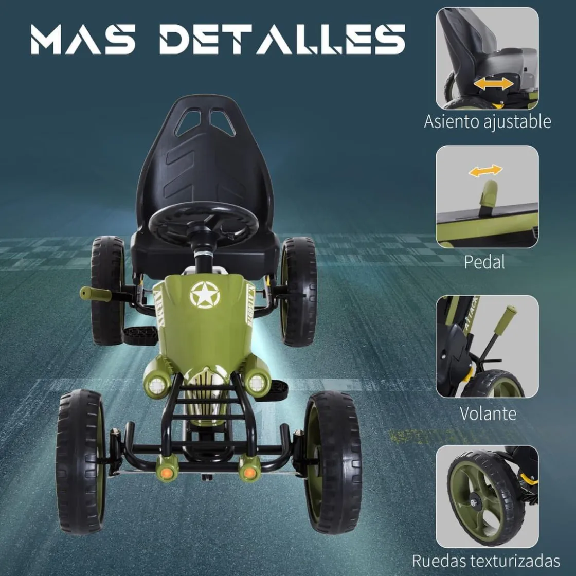 - Kart a pedal, fácil de operar pedaleando hacia adelante y hacia atrás.