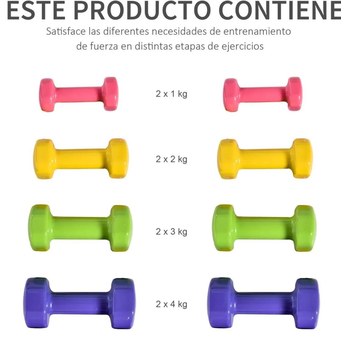 - Incluye 4 pares de pesas en diferentes colores y pesos, 1 kg, 2 kg, 3 kg y 4 kg, para adaptarse a las diferentes etapas de ejercicios.