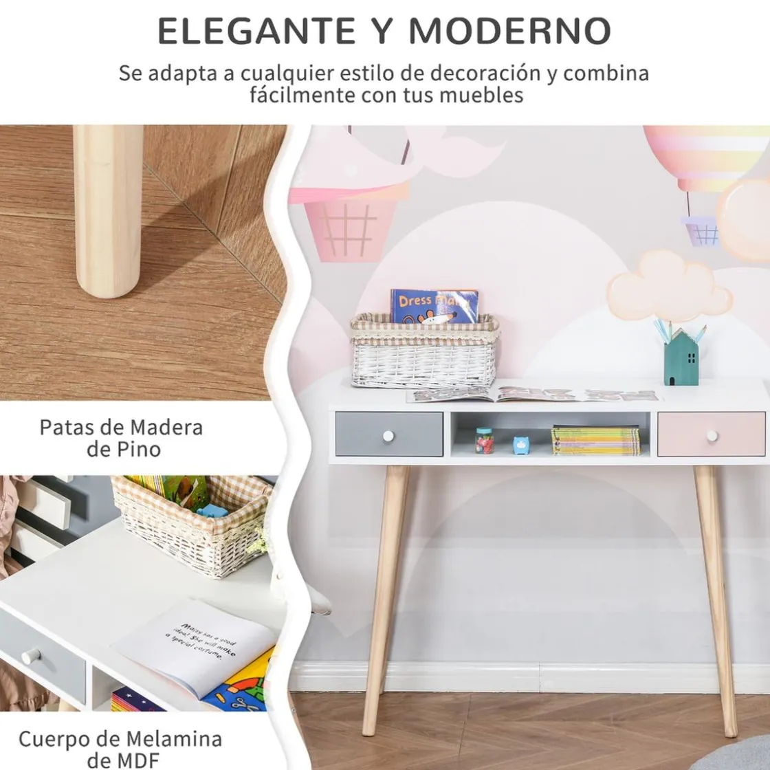 Homcom – Mesa de escritorio infantil, un mueble con bonito diseño que permite usarlo como escritorio, tocador o mesa de consola.