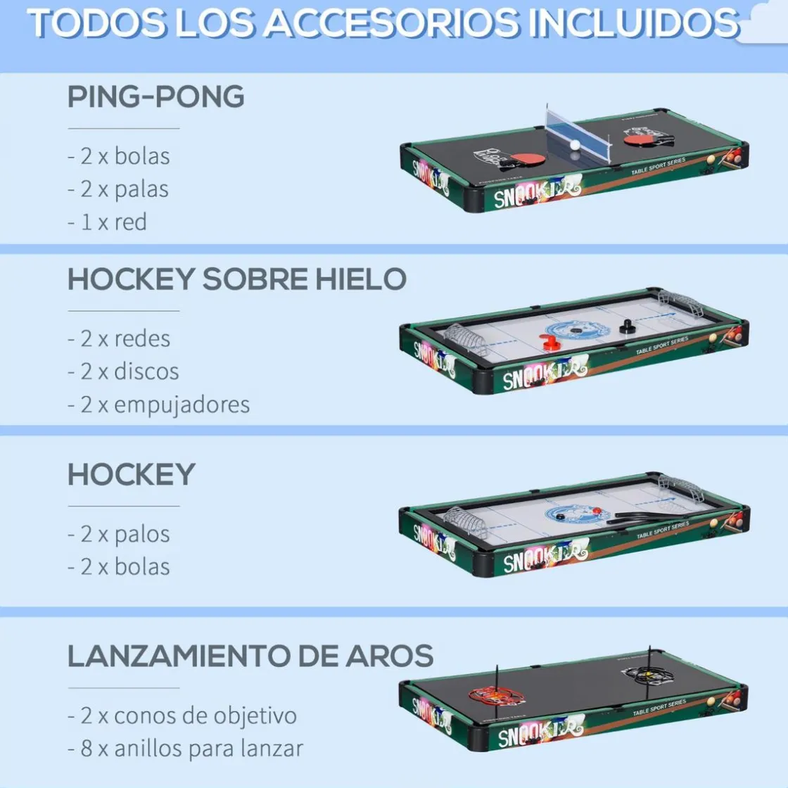 Cuenta con futbolín, mesa de billar, mesa de ping-pong, juego de anillas, mesa de hockey sobre hielo con palo y air hockey. Además, tiene un diseño plegable para un fácil almacenamiento cuando no se usa.