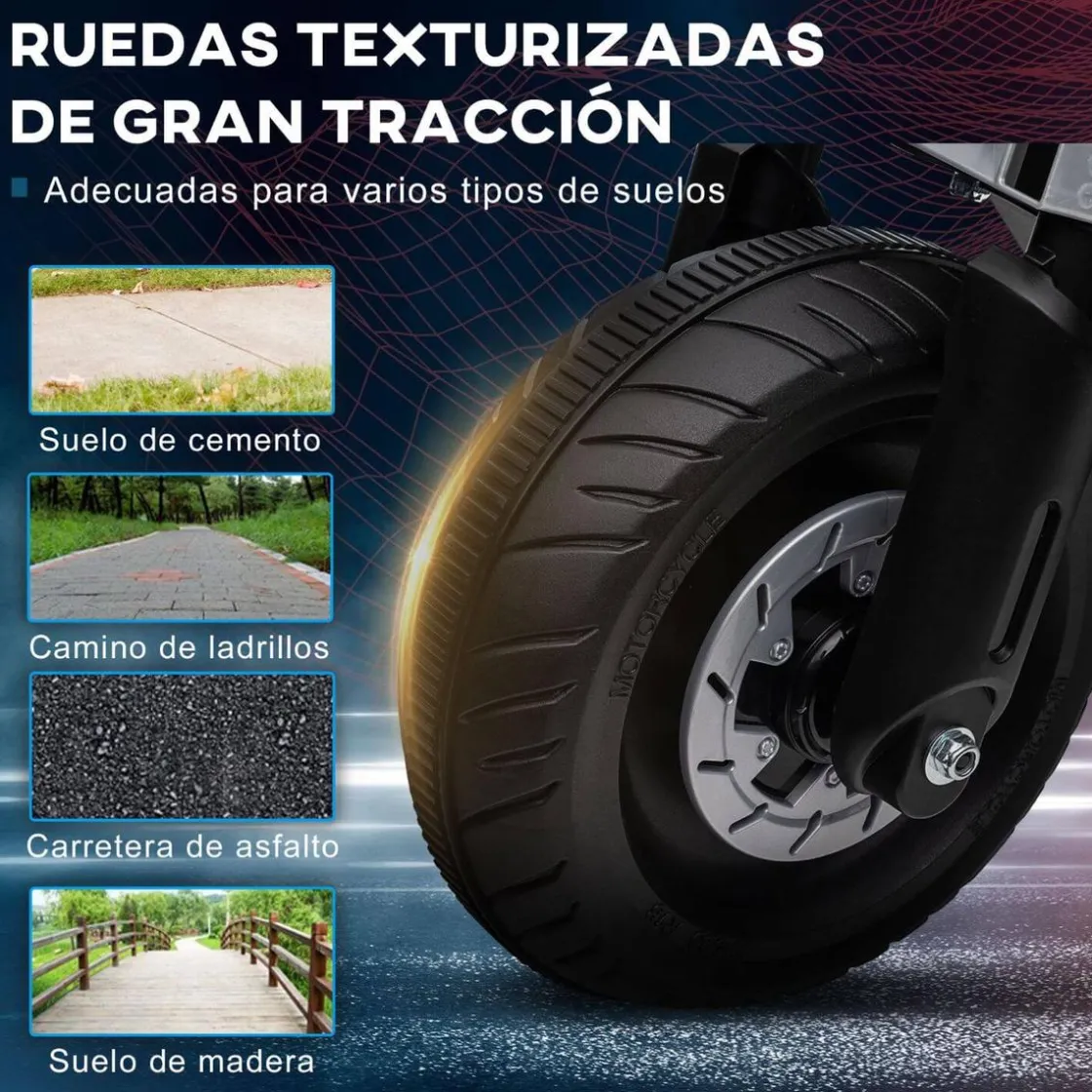- Neumáticos extra anchos con 2 ruedas de equilibrio, para una conducción estable, segura y suave.