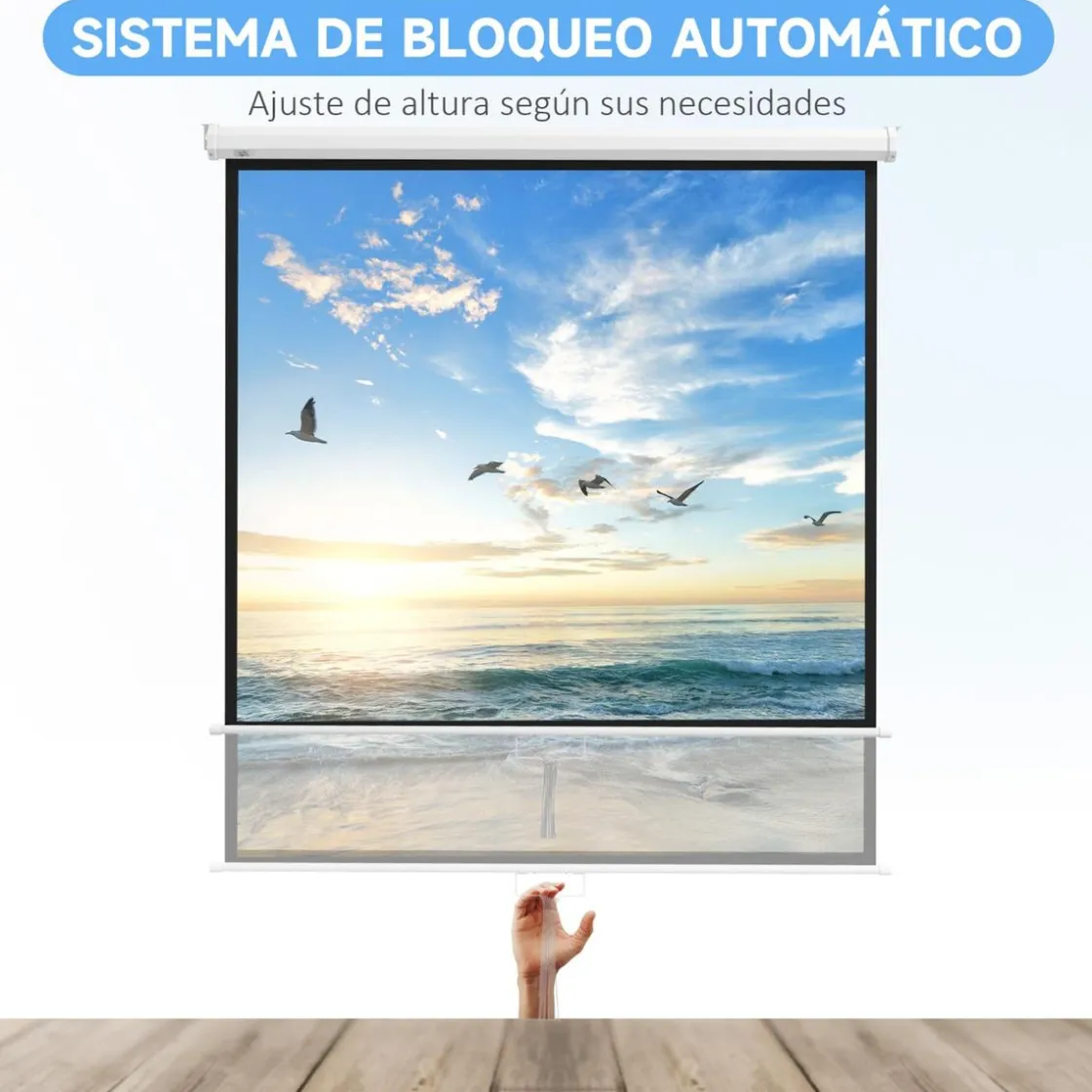 - La pantalla de proyector enrollable cuenta con un sistema de bloqueo automático suave con correas para facilitar el ajuste de la altura.
