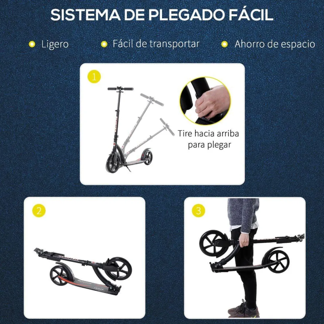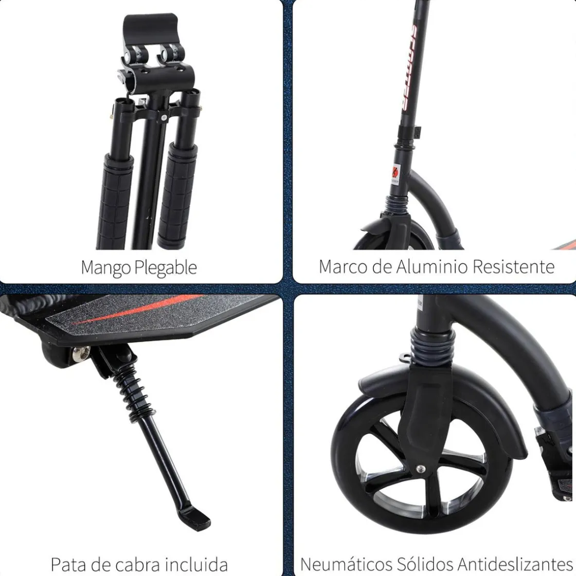 Si tienes 14 años o más y buscas un patinete, este de HOMCOM te gustará. Cuenta con una base amplia antideslizante para poder poner cómodamente los pies, ruedas grandes de PU con amortiguación de impactos, manillar regulable en altura y con empuñaduras acolchadas, freno posterior y caballete para poderlo parar manteniéndolo de pie ¡no lo pienses más, es el patinete que estabas buscando!
