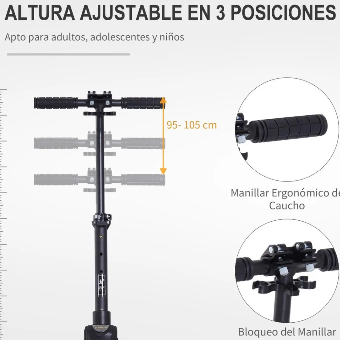 Este cómodo patinete se pliega fácilmente en un solo paso, para que transportarlo o guardarlo en casa sea muy sencillo. Como su manillar es regulable, lo pueden utilizar personas de diferentes estaturas. La altura mínima del manillar es de 95 cm y la máxima, de 105 cm.