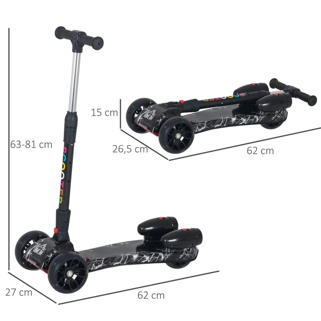 Medidas totales: 62 x 27 x 63-81 cm. Medidas scooter plegado 67 x 29 x 14 cm. Batería para niebla de agua 3,7 V, 3000 mAh, con batería de litio recargable. Capacidad de carga 50 kg. Edad recomendada mayores de 3 años.
