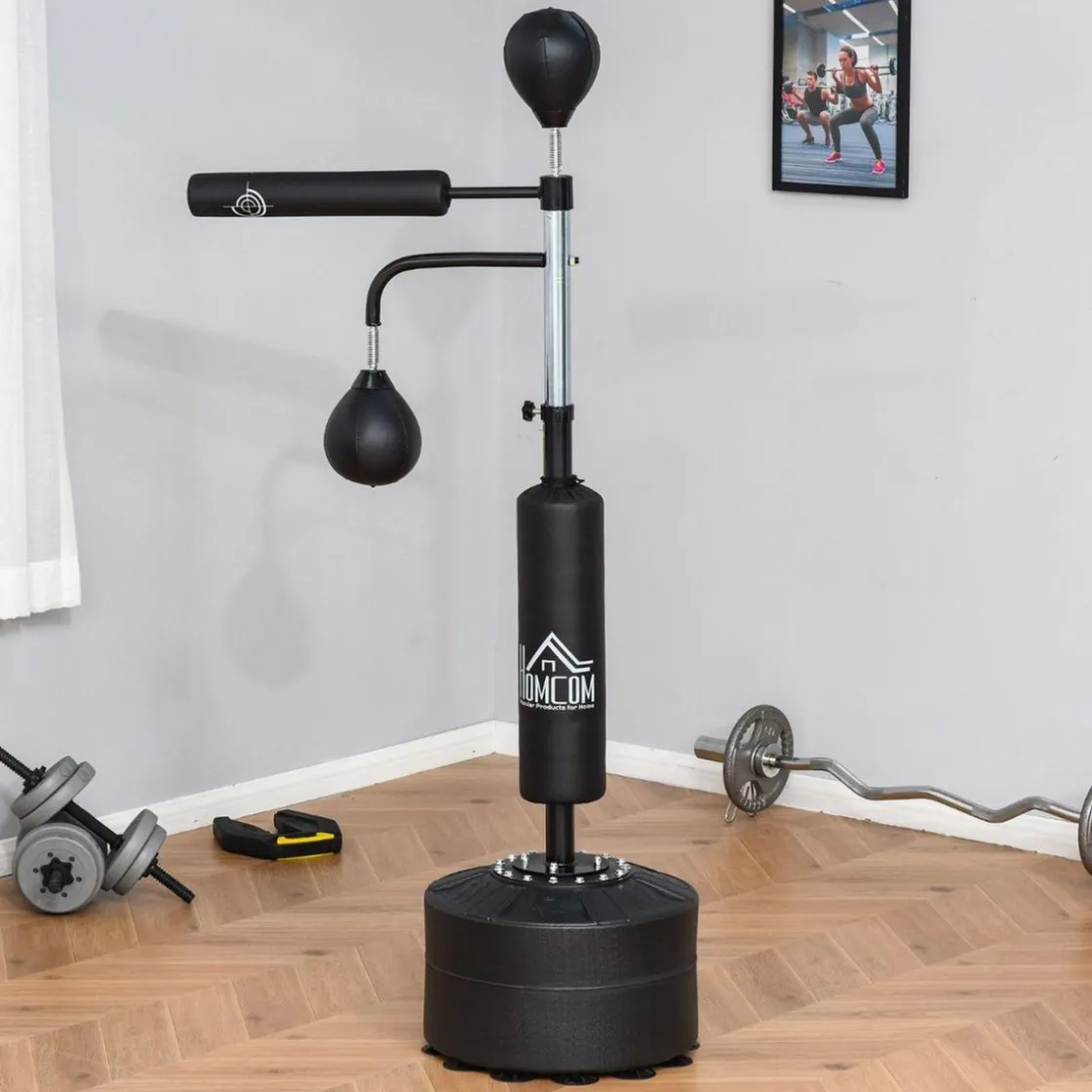 ¿Sabías que el boxeo es ideal para descargar tensiones y ejercitar distintos músculos del cuerpo? Con la práctica de esta disciplina, mejoramos la flexibilidad, agilidad, reacción de movimientos, etc. Además, con este saco de boxeo con soporte con barra giratoria de Homcom, podrás realizar un entrenamiento integral y profesional en casa. Cuenta con un saco central, dos peras de boxeo y una barra giratoria. Y la base se puede llenar con agua o arena para mayor estabilidad.