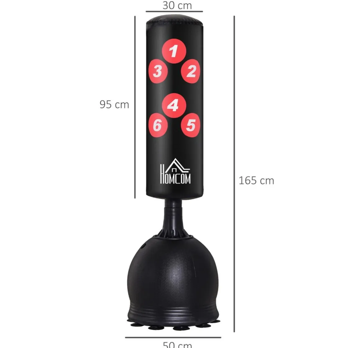 Medidas totales: Ø50 x 165 cm. Medidas de la base Ø50 x 43 cm. Medidas del saco de boxeo Ø30 x 95 cm. Peso neto 20,15 kg.