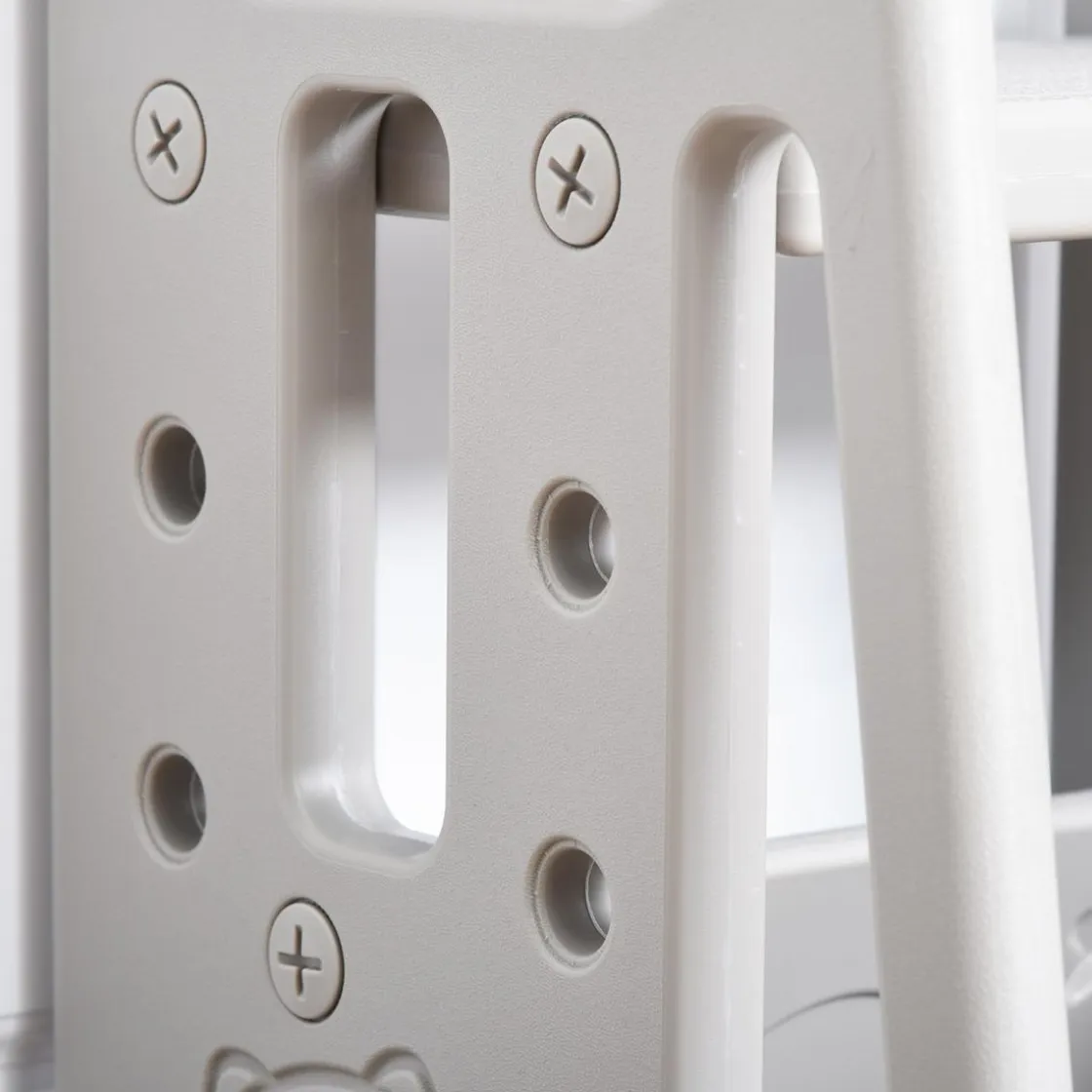Taburete infantil con un peldaño superior ajustable en 3 posiciones diferentes, para adaptar a la estatura de los pequeños. Proporciona un soporte seguro para los niños, ayudando a desarrollar su independencia.