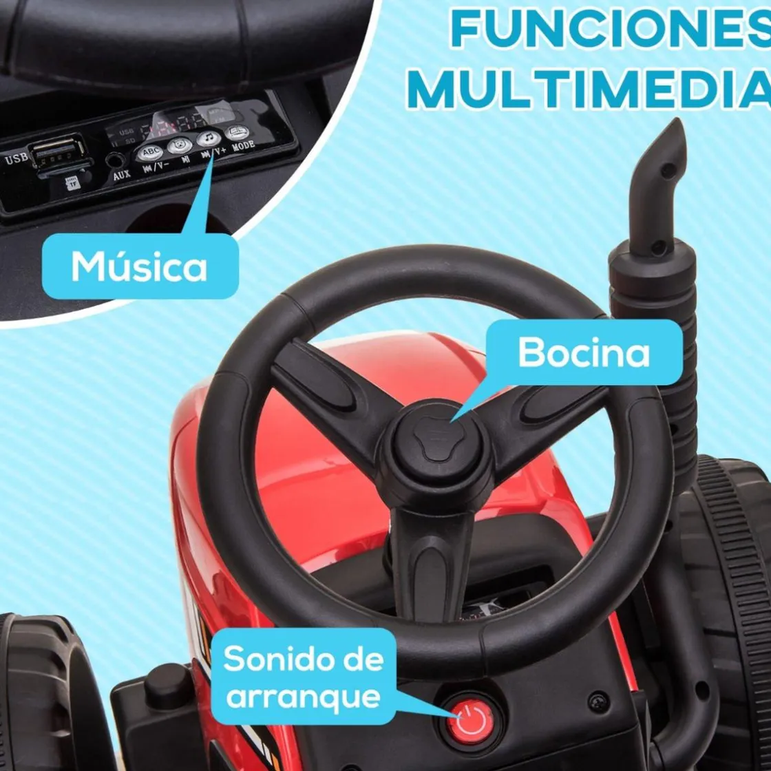 Homcom – Tractor elécrico Rojo, un tractor eléctrico con un remolque desmontable en la parte trasera, ideal para que los más pequeños lleven algunos juguetes durante el paseo.