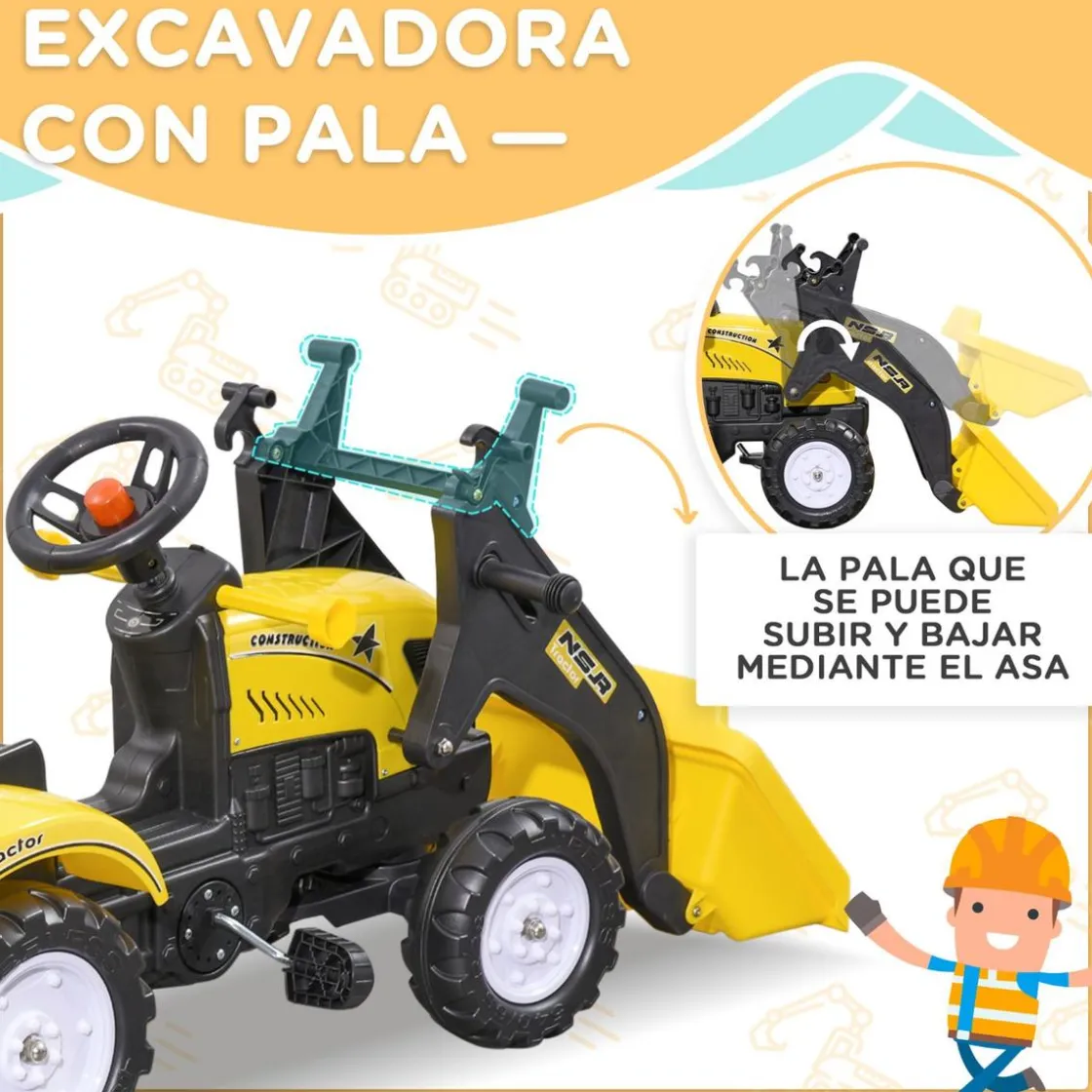 Homcom – Tractor excavadora a pedales con remolque amarillo, divertidísimo tractor que se mueve fácilmente pedaleando hacia delante y hacia atrás. También se pueden mover sus palas de forma fácil.