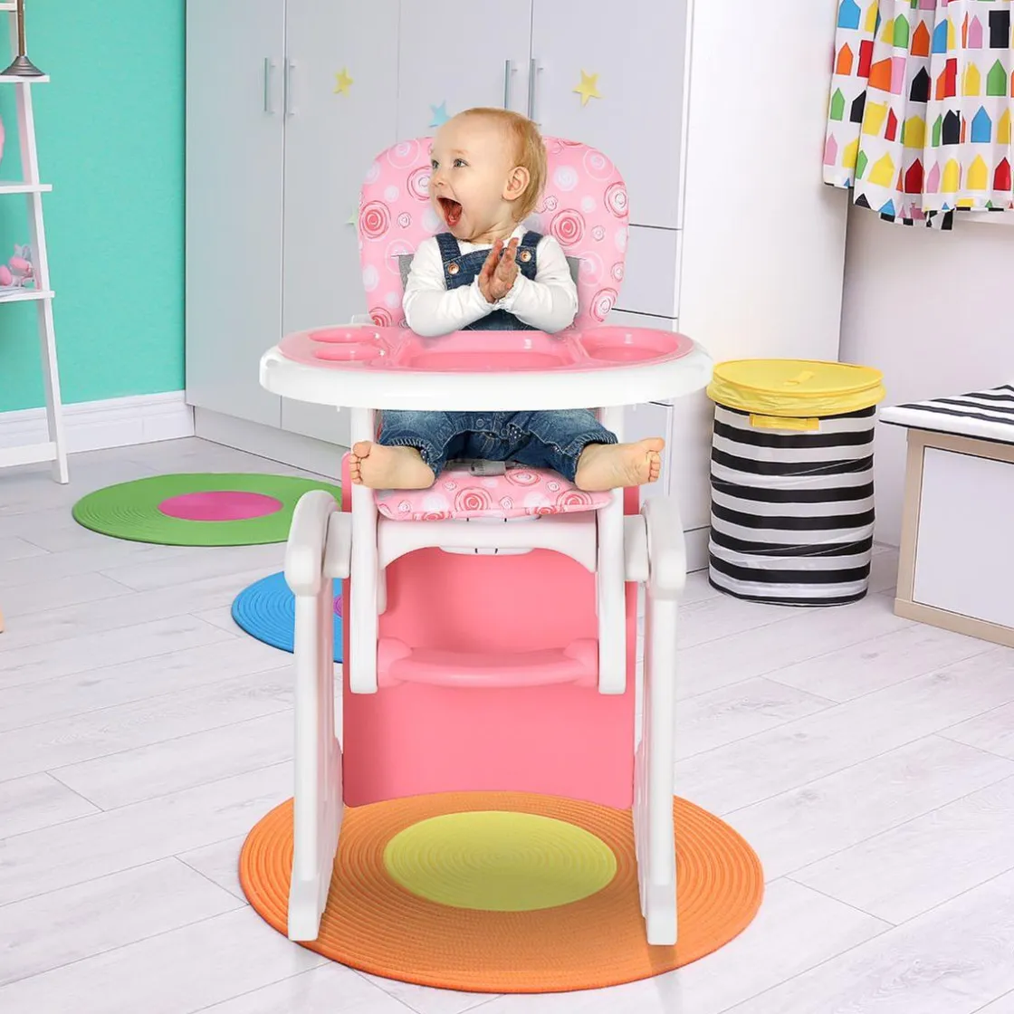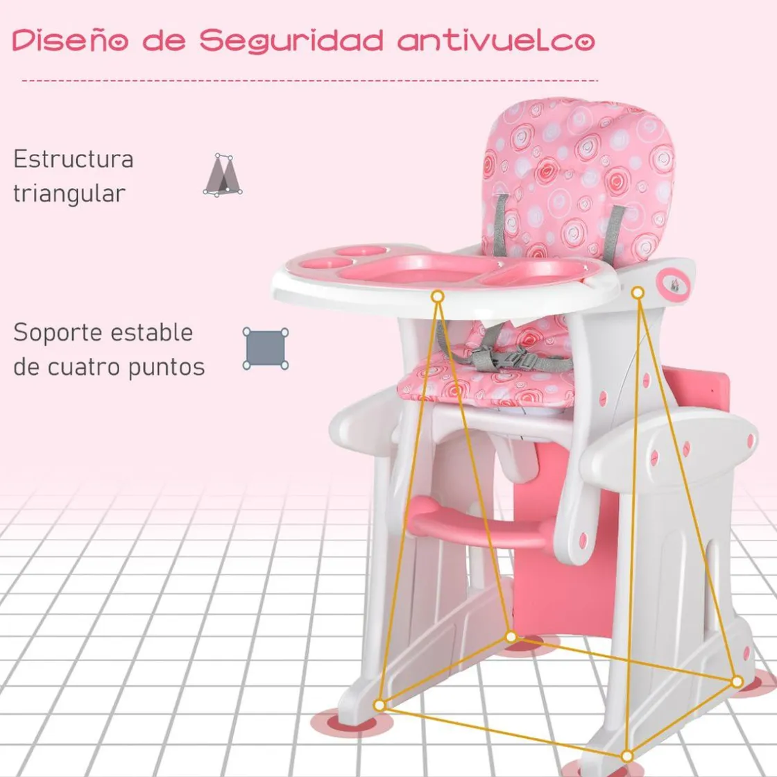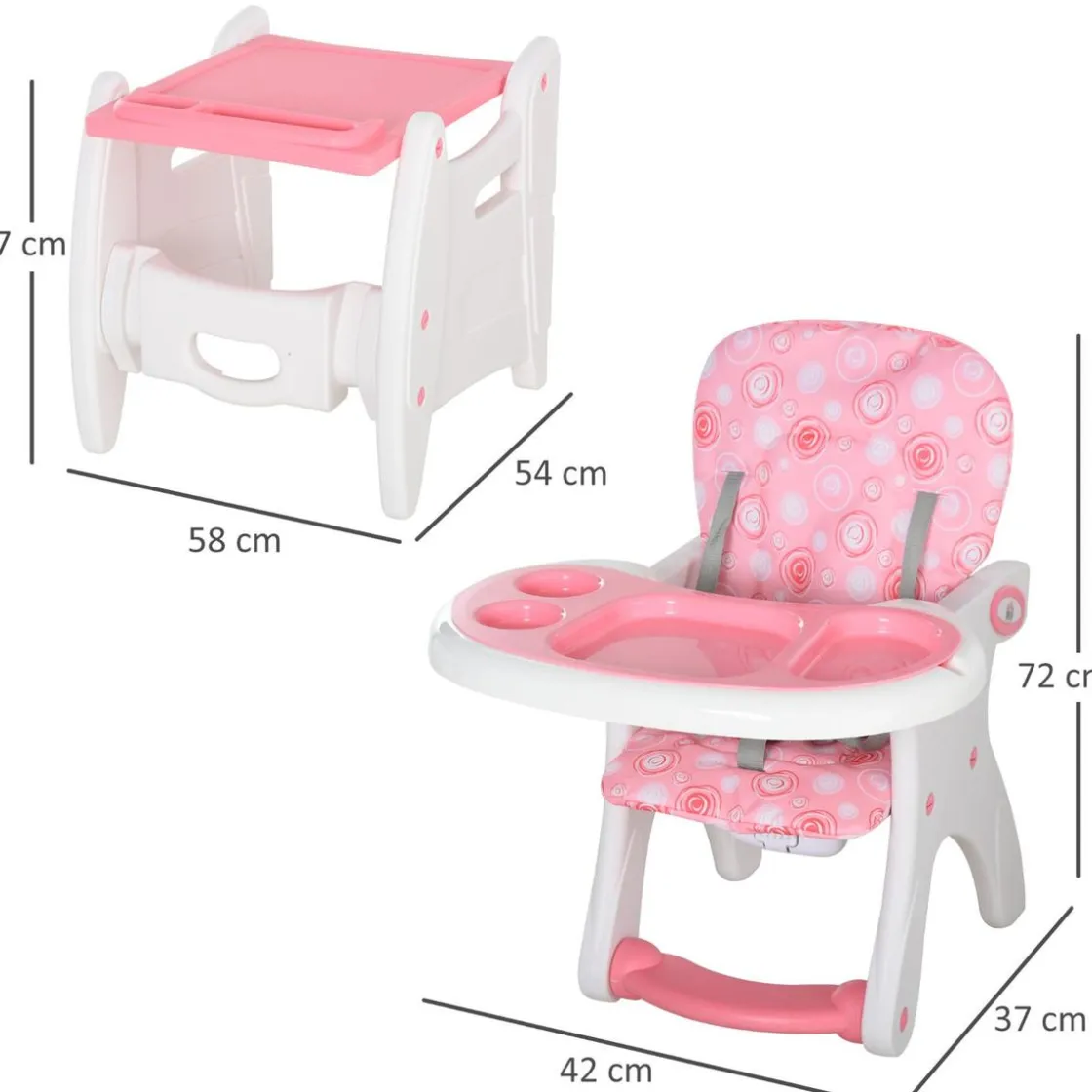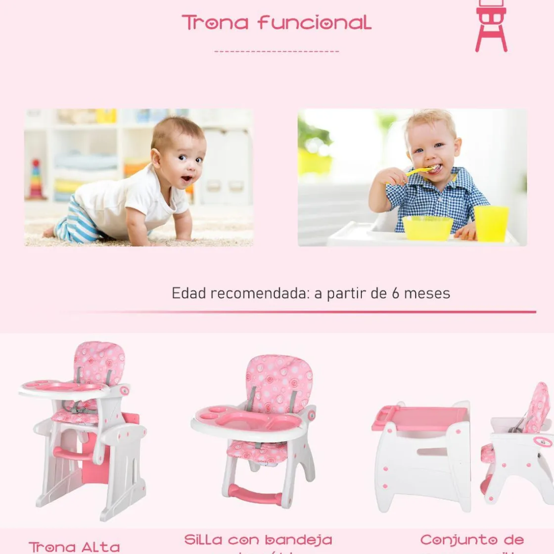 Homcom – Trona 3 en 1 rosa, una trona con bandeja ideal para alimentar al bebé de forma cómoda y cuando crezca se convierte en una silla y una mesa para que dibuje y juegue.