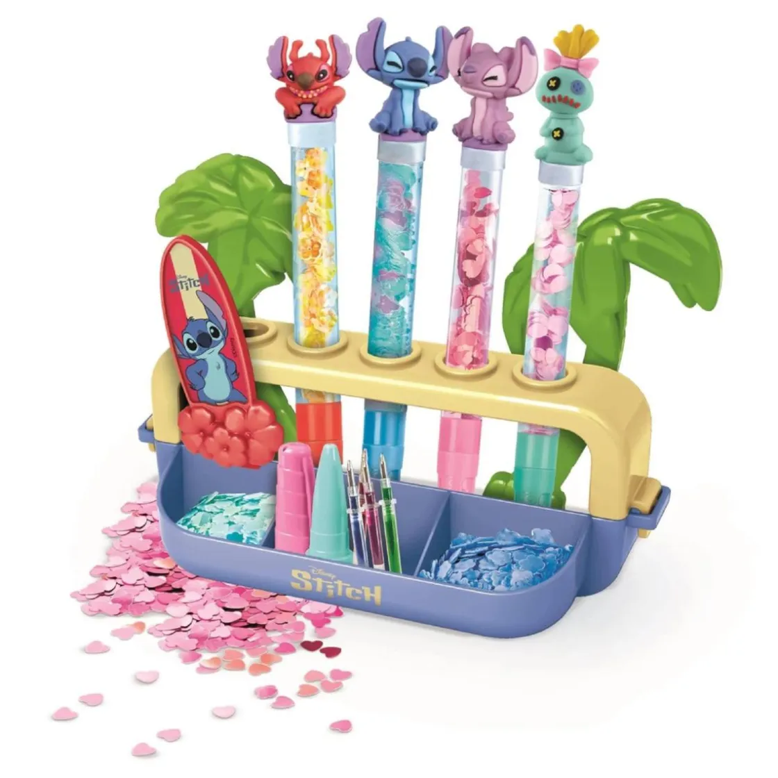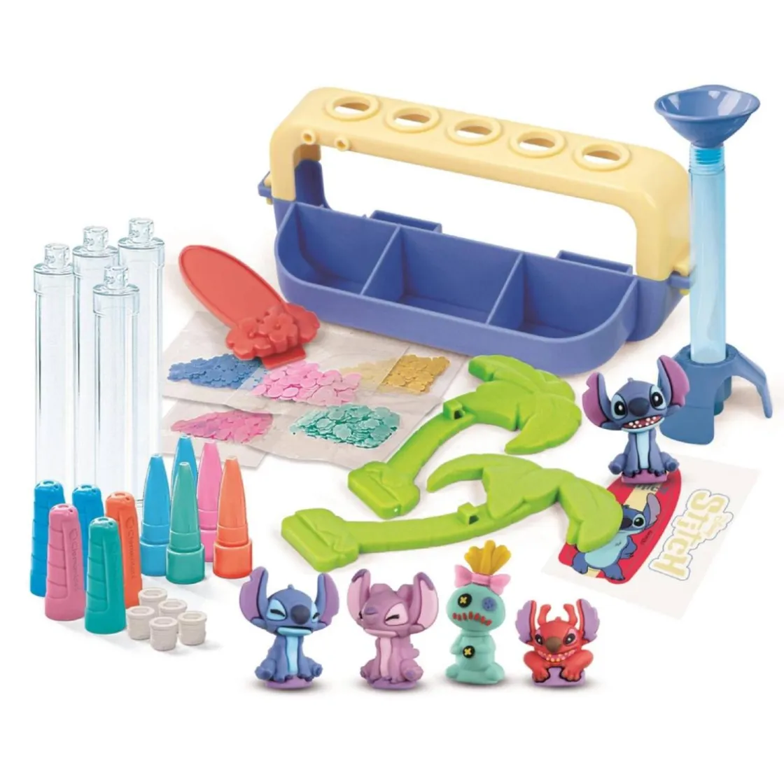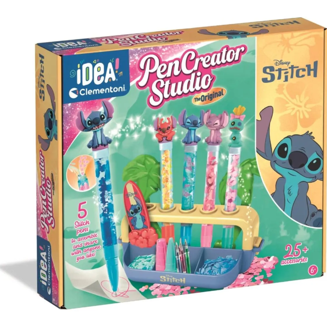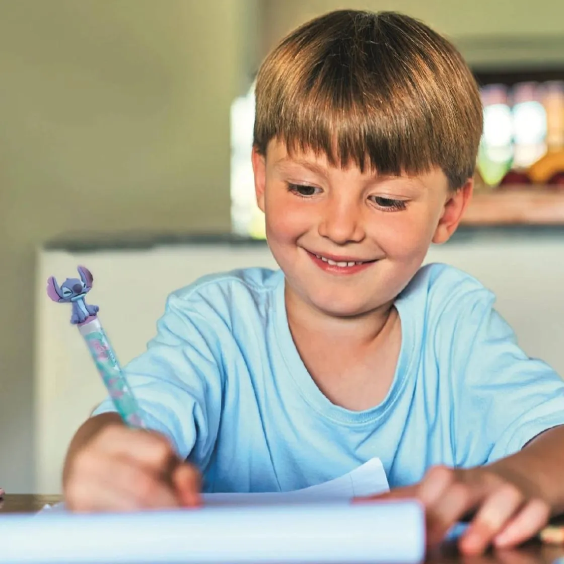 Explora tu lado más creativo con el set Create Your Stitch Pens de Clementoni. Este kit perteneciente a la línea Idea permite fabricar y personalizar hasta 5 bolígrafos con temática de Stitch, usando tintas de colores, stickers, adornos iridiscentes, cuentas y más.