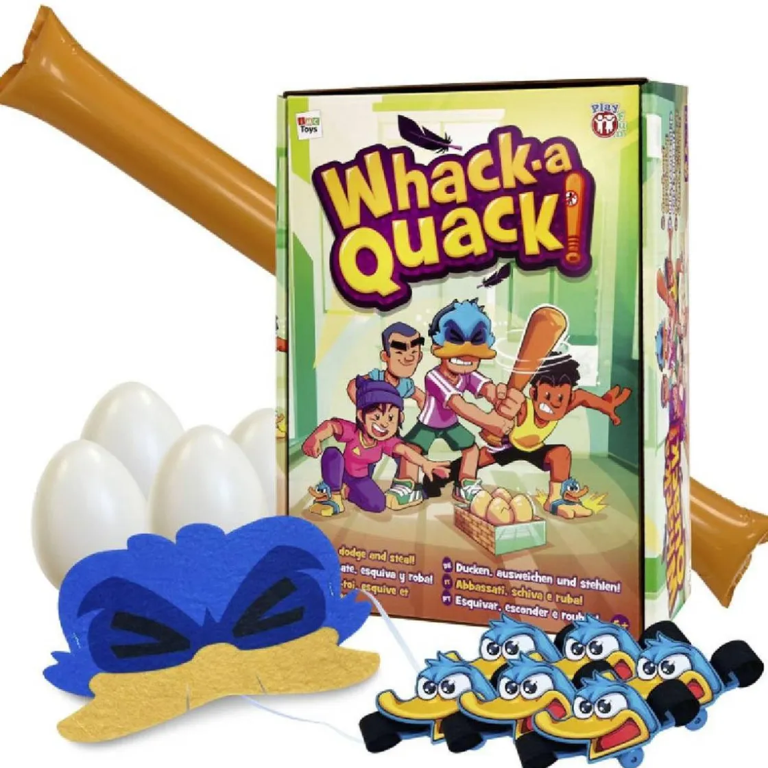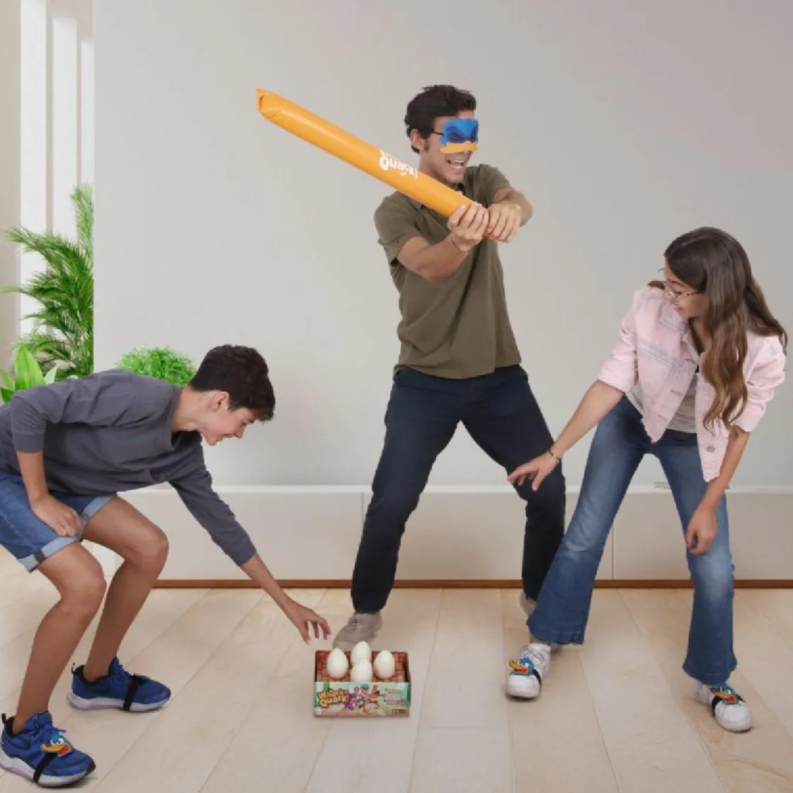 En este dinámico juego, un jugador debe proteger los huevos, con una máscara y un bate inflable para resguardar los preciados huevos. Mientras tanto, el resto de los jugadores, equipados con patas de pato que hacen ruido, intentan robar los huevos sin ser atrapados.