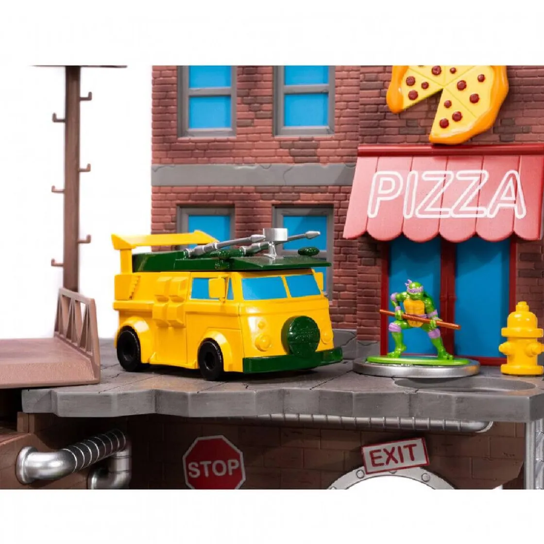 La Nano Escena es muy detallada, con múltiples niveles, autobús de fiesta Tortugas Ninja, pizzería, puente ajustable y accesorios.