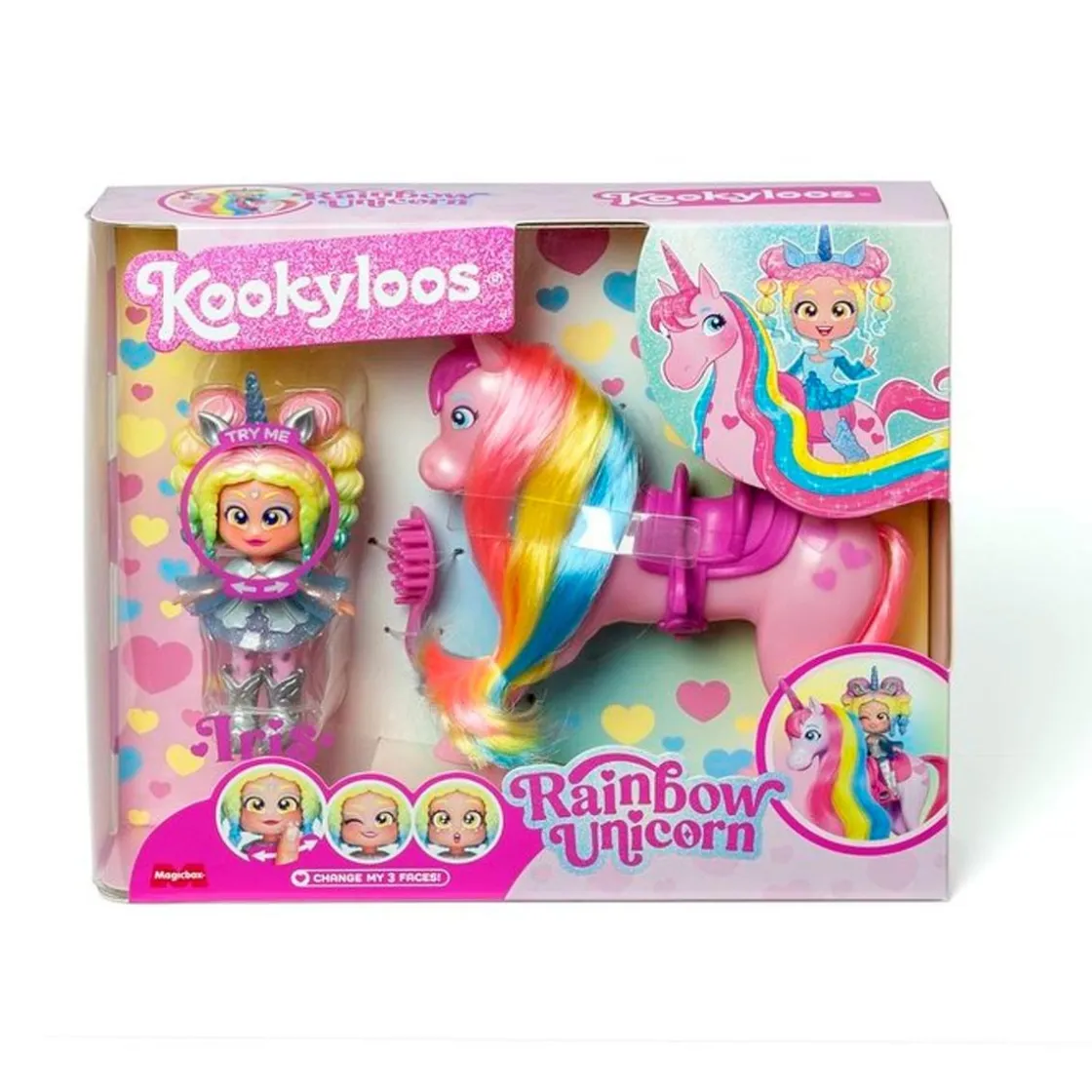 Descubre el mundo mágico de Kookyloos con Rainbow Unicorn donde la diversión y la fantasía se unen. Con tu nueva amiga Iris, podrás explorar reinos de colores y vivir aventuras fabulosas. ¡Imagina que cabalgas sobre tu propio unicornio Rainbow! Además, con el peine incluido, podrás peinar la crin de Rainbow y hacerle distintos estilos.