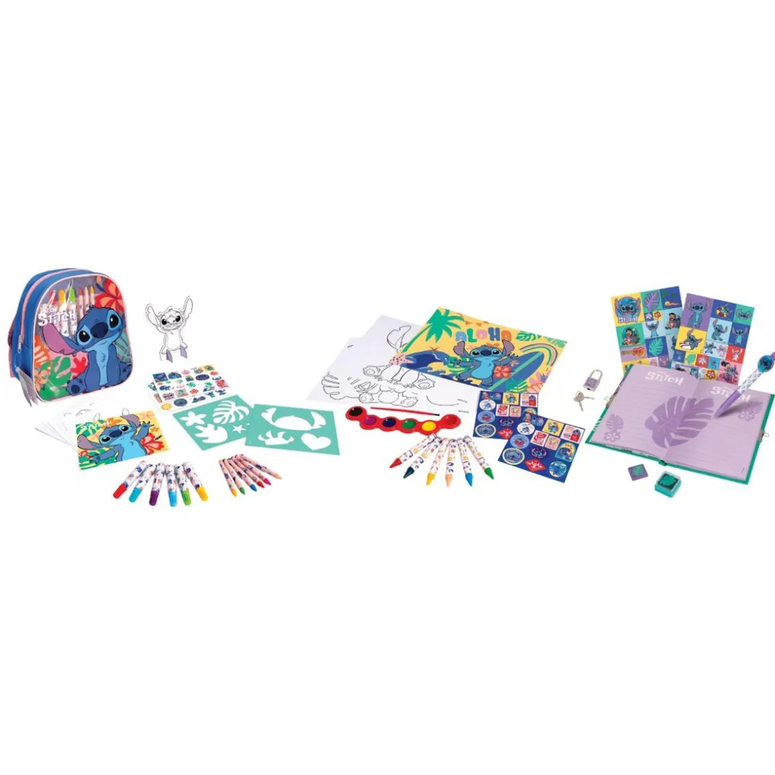 - 1 mochila con 20 hojas para pintar, 6 rotuladores, 6 pinturas de cera, 2 hojas de pegatinas, 2 plantillas y 1 figura de Stitch para colorear y montar.