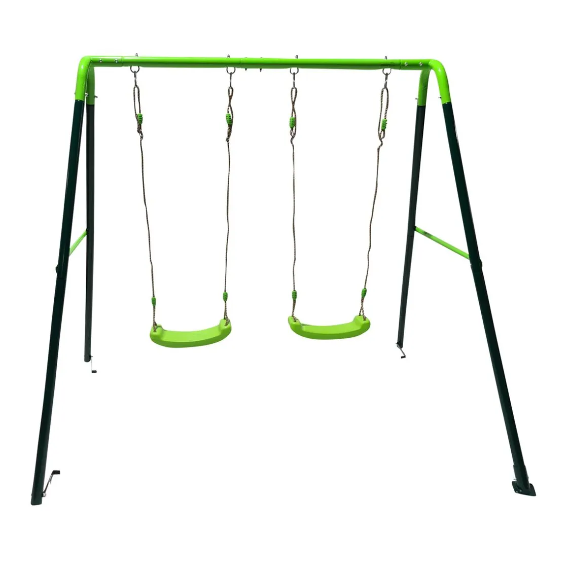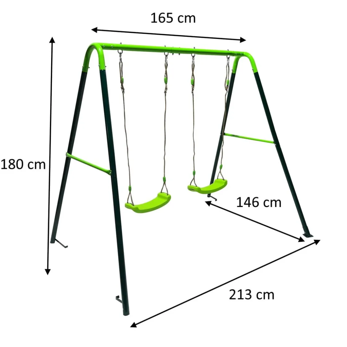Las medidas del columpio doble Olea son: 213 cm (largo) x 146 cm (ancho) x 180 cm (alto). El larguero de arriba tiene una longitud de 165 cm. El área de seguridad del columpio es de 560 cm (largo) x 213 cm (ancho).