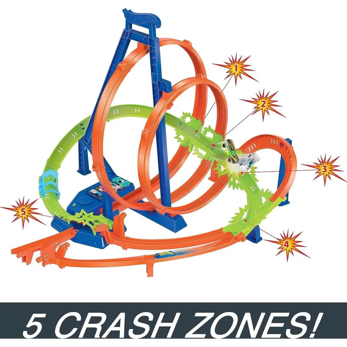 La pista incluida en el conjunto presenta dos loopings y un propulsor motorizado que mantendrá los coches en movimiento constante. Incluso puedes experimentar con las construcciones, ya que los componentes de la pista fácilmente montables son compatibles con otras pistas. Además, no tienes que preocuparte por el almacenamiento ya que el conjunto entero se pliega para guardarlo cómodamente.