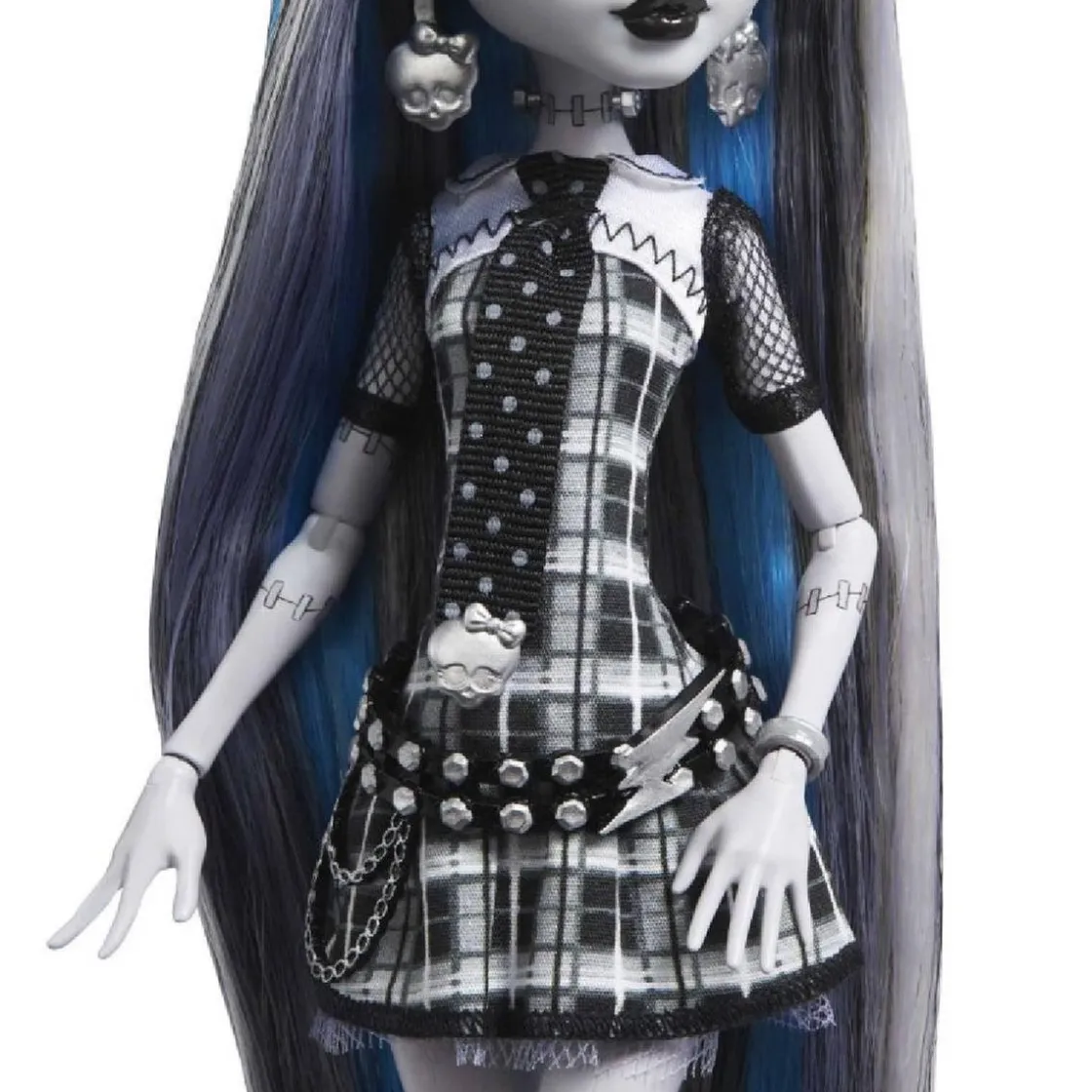 - Edición en blanco y negro: Frankie Stein luce un elegante conjunto monocromático, con detalles que reflejan su personalidad característica.