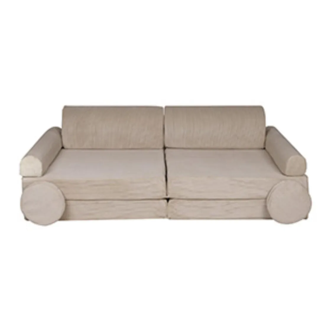 La cubierta de pana suave al tacto es una de las características destacadas de este sofá, garantizando una superficie delicada que asegura la comodidad durante el uso. Además, su fácil limpieza es clave para afrontar las travesuras de los pequeños artistas. Equipado con dos pufs, estos no solo son elementos decorativos, sino también accesorios funcionales que añaden alegría y comodidad al tiempo de juego.