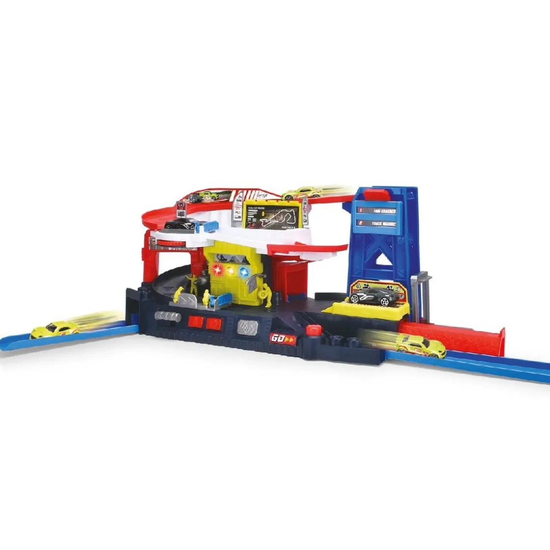 Tendrás el control de tu equipo de Fórmula 1 con este garaje de coches de carreras de Motor & Co. ¡Corre con tu coche por la pista de acceso para detenerlo en la parada para repostar!