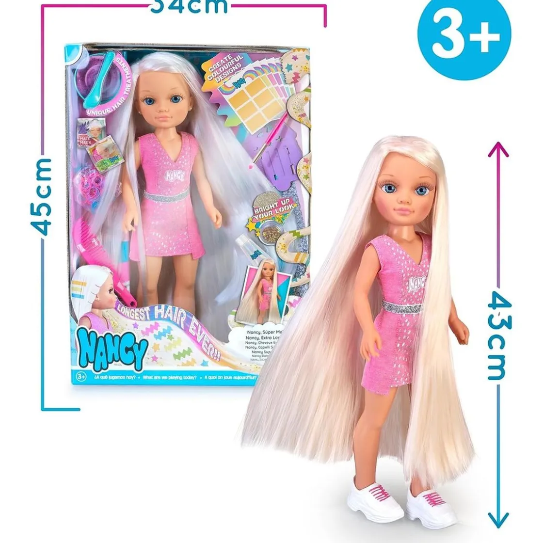 Nancy Súper Melena convertirá cada tarde de juego en una gran aventura. Gracias a su melena extra larga y los accesorios que la acompañan, tendrás un sinfín de posibilidades para crear e imaginar. Prueba diferentes estilos de peinado, como trenzas, coletas o rizos, y combina los diferentes accesorios para hacer de cada día una experiencia única. Además, Nancy tiene una altura de 45 cm, lo que facilitará el manejo a la hora de crear los estilismos.