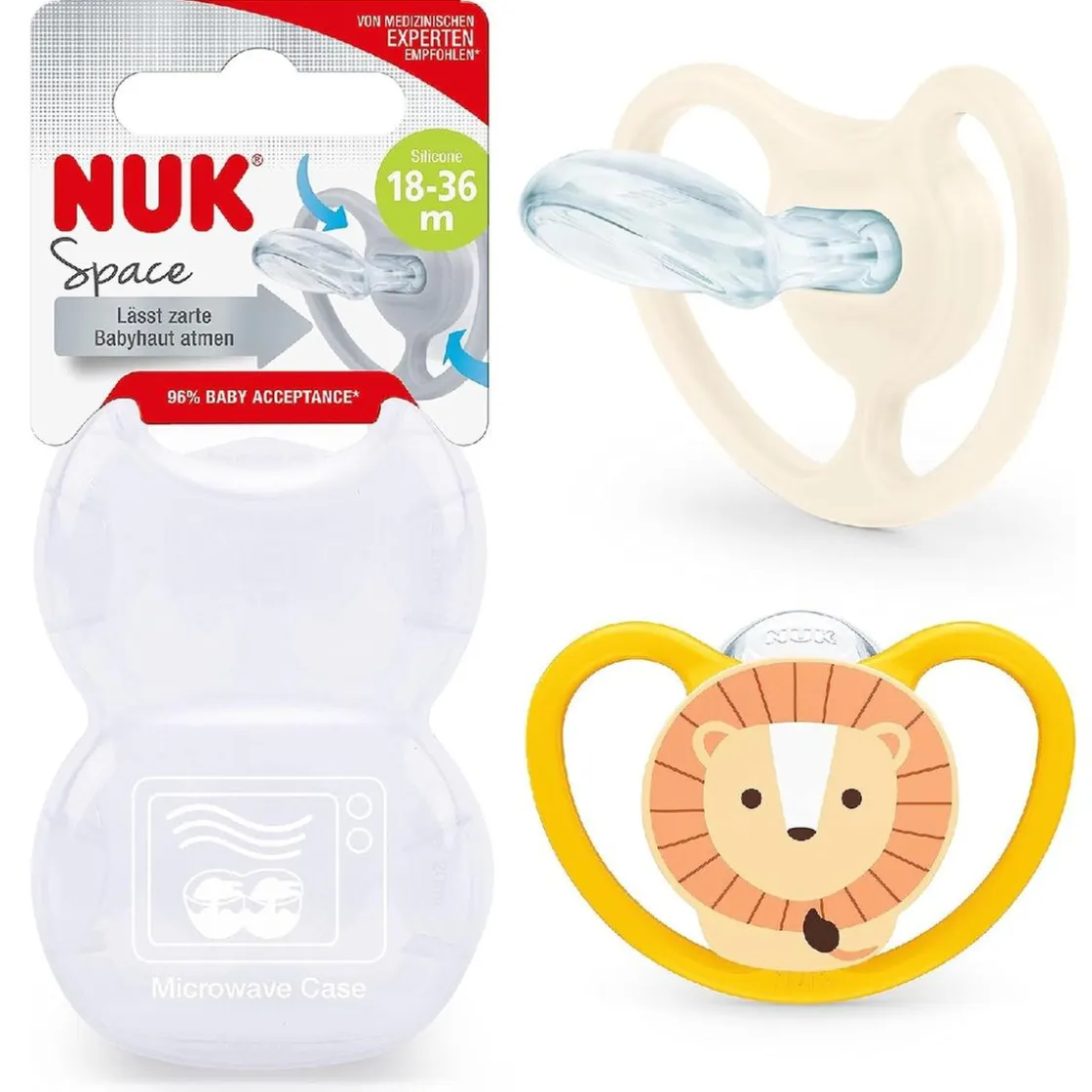Nuk – Pack 2 chupetes Space silicona 18-36 meses León/Sol, un pack de 2 chupetes de silicona, diseñado para bebés de 18 a 36 meses.