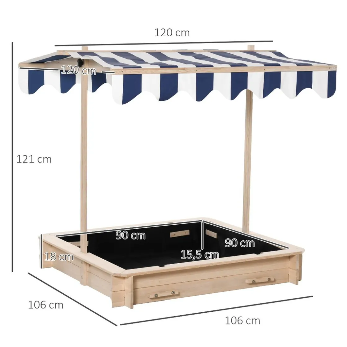 El arenero está hecho de madera de cedro y también tiene un toldo ajustable, para proteger a los niños del sol mientras se divierten. El toldo de este arenero infantil se puede regular en altura y en ángulo, para proteger a los más pequeños del sol mientras juegan.