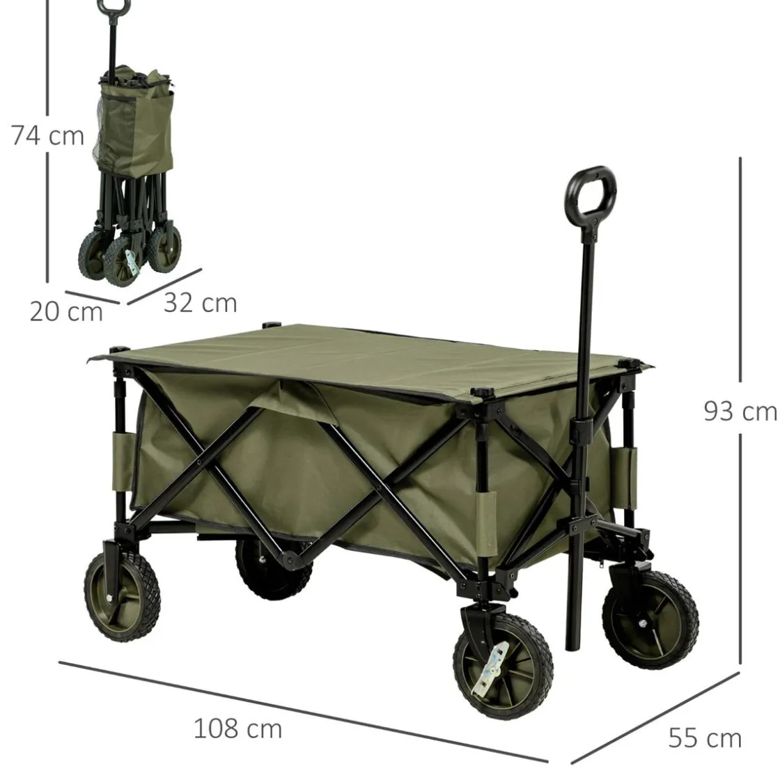 Outsunny – Carro con tablero plegable Verde, un remolque plegable con bolsa grande de almacenaje y capaz de soportar hasta 100 kg de carga, es muy adecuado para compras, deporte, camping o cualquier actividad que necesites transportar artículos.