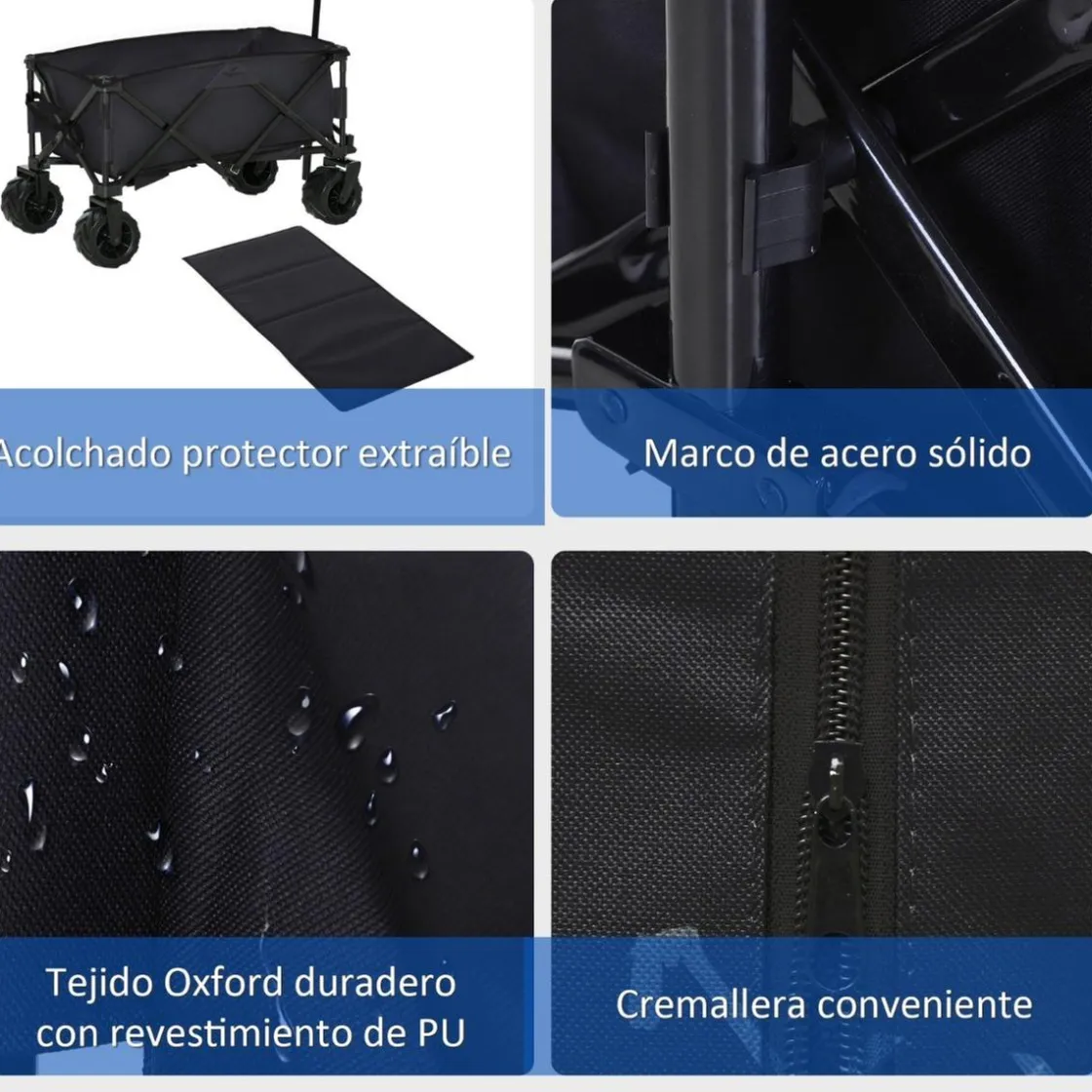 ¡Este carro de transporte Outsunny reducirá tus cargas de manera efectiva! Cuando vas de camping, vas a la playa o de pesca, ya no necesitarás llevar un bolso grande para llevar tus cosas, este carrito plegable será suficiente. También podrá ayudarte con tareas domésticas como ir a la compra o trabajos de bricolaje y jardinería. Es fácil de instalar y plegar, lo que facilita su almacenamiento y transporte. ¡Un excelente ayudante para mejorar tu calidad de vida!