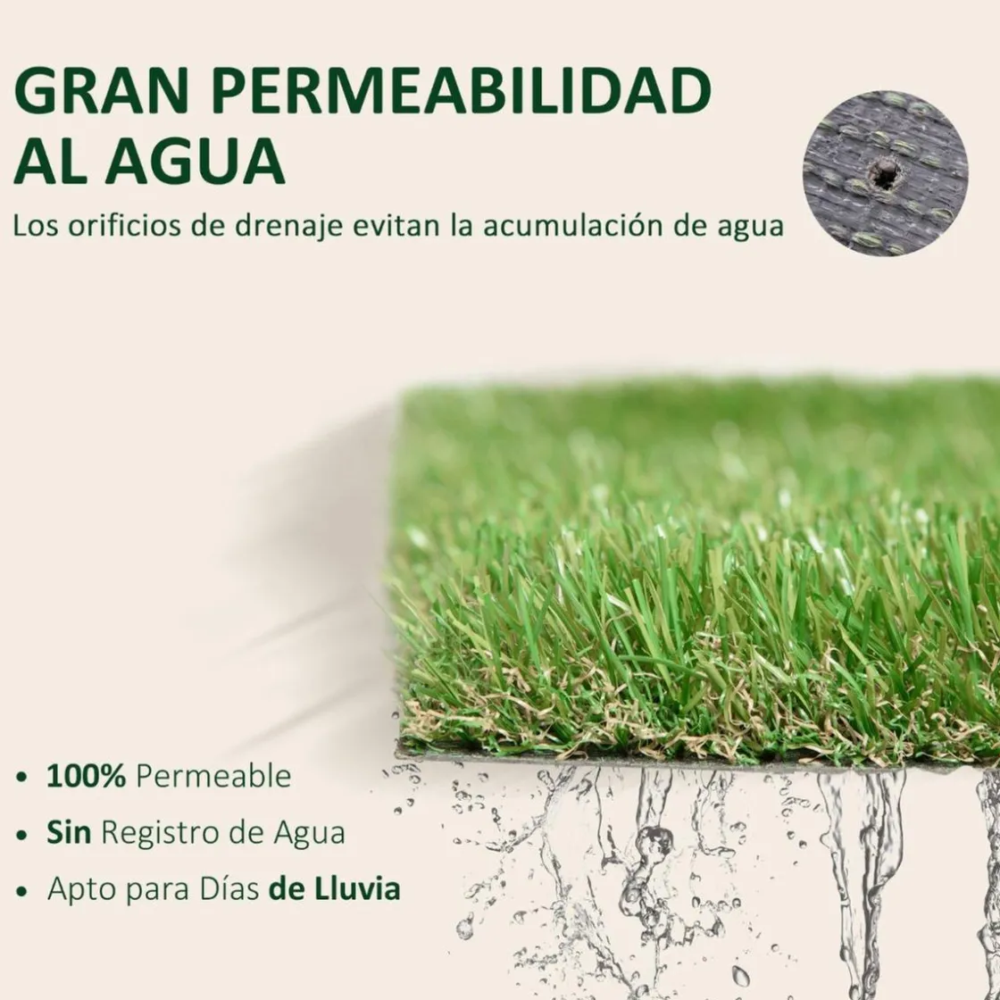 Este producto se presenta en rollo para facilitar su instalación y cuenta con orificios de drenaje para que el agua no se encharque cuando llueva, ya que no requiere riego.