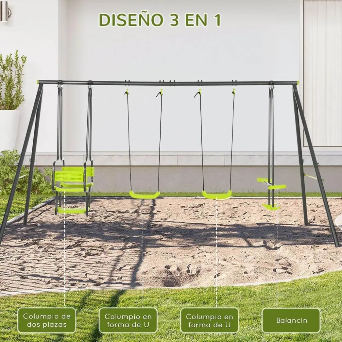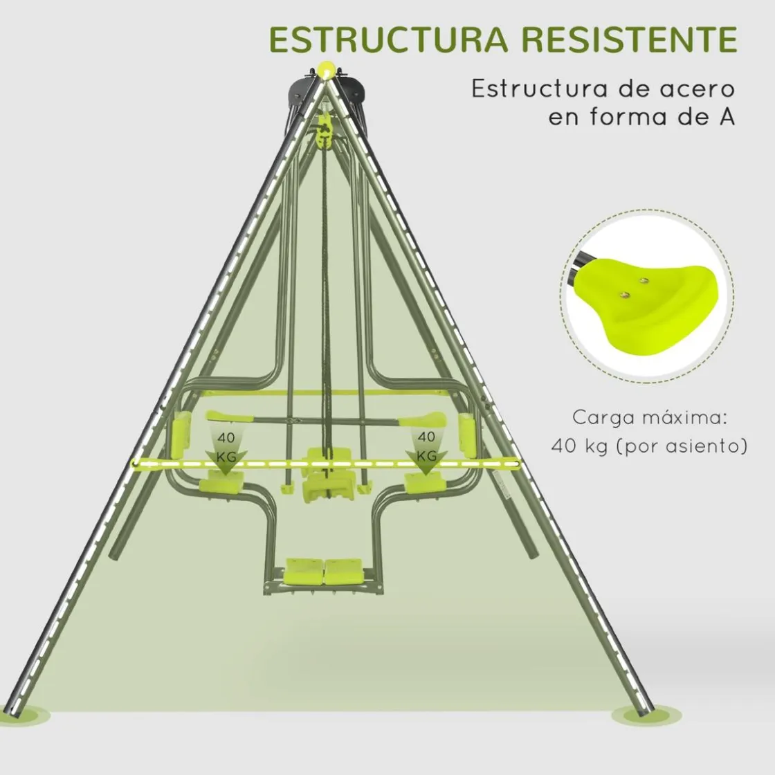 - Conjunto de recreo infantil con estructura metálica reforzada en forma de A.