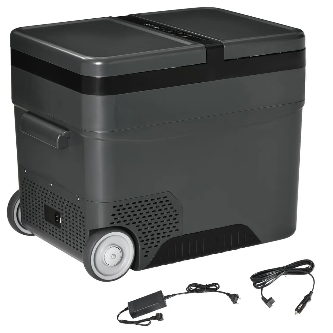 - Nevera eléctrica tiene ruedas, asas laterales y tirador para llevarlo cómodamente a cualquier parte.