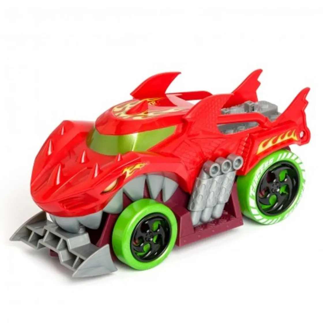 El camión lanzador destaca por su forma aerodinámica y sus llamativos colores rojos y verdes, evocando el poder del fuego y haciendo que cada lanzamiento sea una experiencia única. Su transformación en un lanzador veloz es tan fácil como abrir el camión, colocar uno de los coches y dejar que la magia del dragón haga el resto.