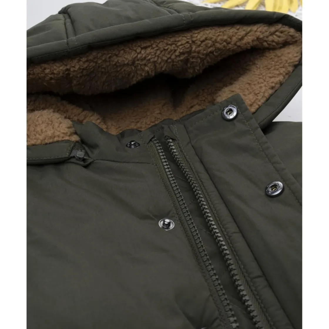 El abrigo acolchado con capucha en color verde oscuro es ideal para proteger del frío con estilo. Cuenta con un interior en pelo sintético marrón que aporta una agradable sensación de calidez y suavidad, perfecto para los días más fríos del invierno.
