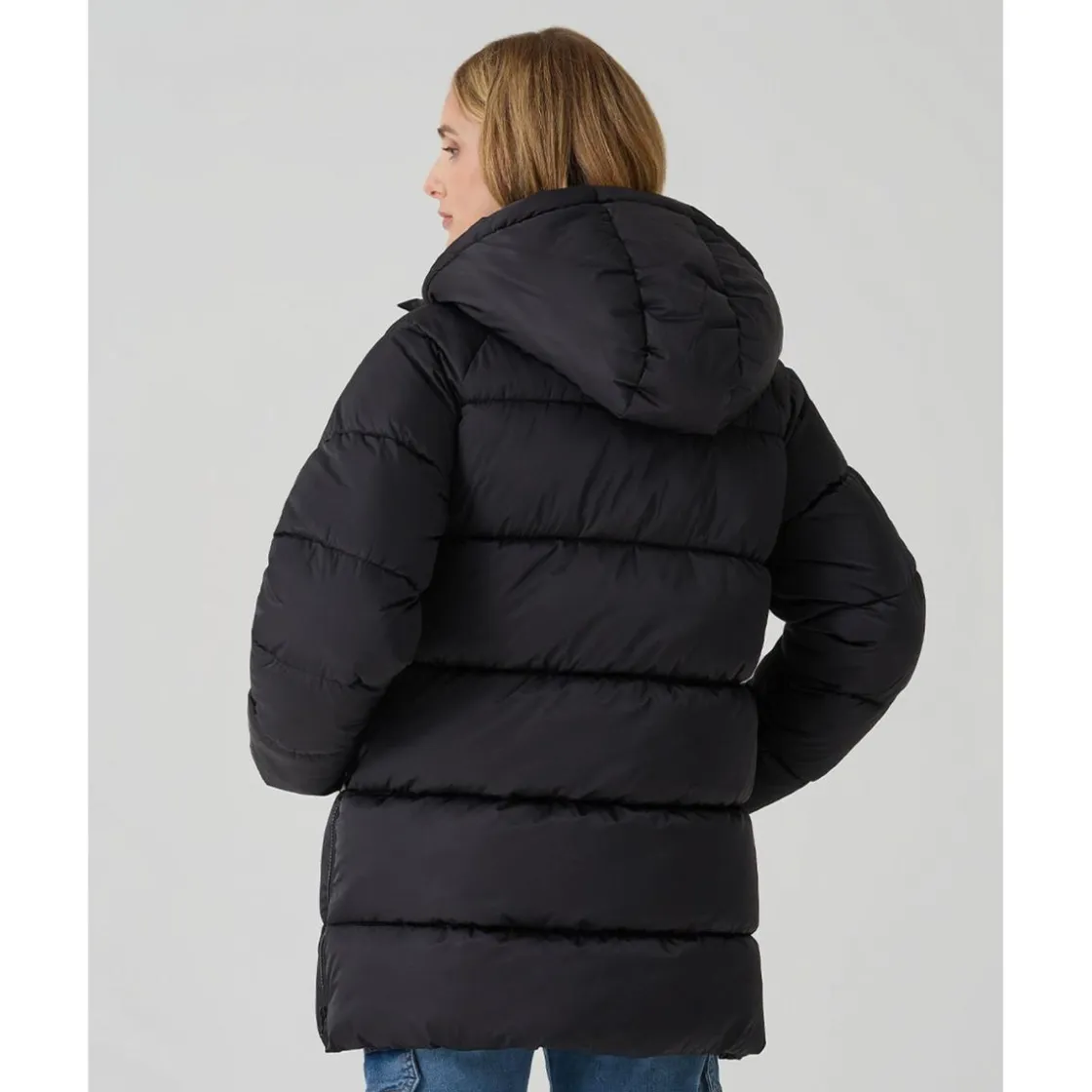 El abrigo premamá en negro es una prenda esencial para el invierno. Su corte largo, con capucha y bolsillos laterales, proporciona máxima protección contra el frío y comodidad durante todo el embarazo.