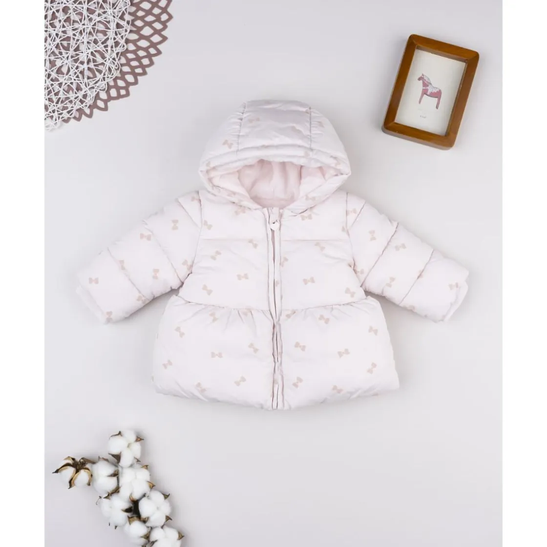 El abrigo en tono rosa con estampado de lazos allover es cálido y encantador. Confeccionado con capucha y cierre de cremallera en la parte frontal, ofrece un ajuste práctico y cómodo.