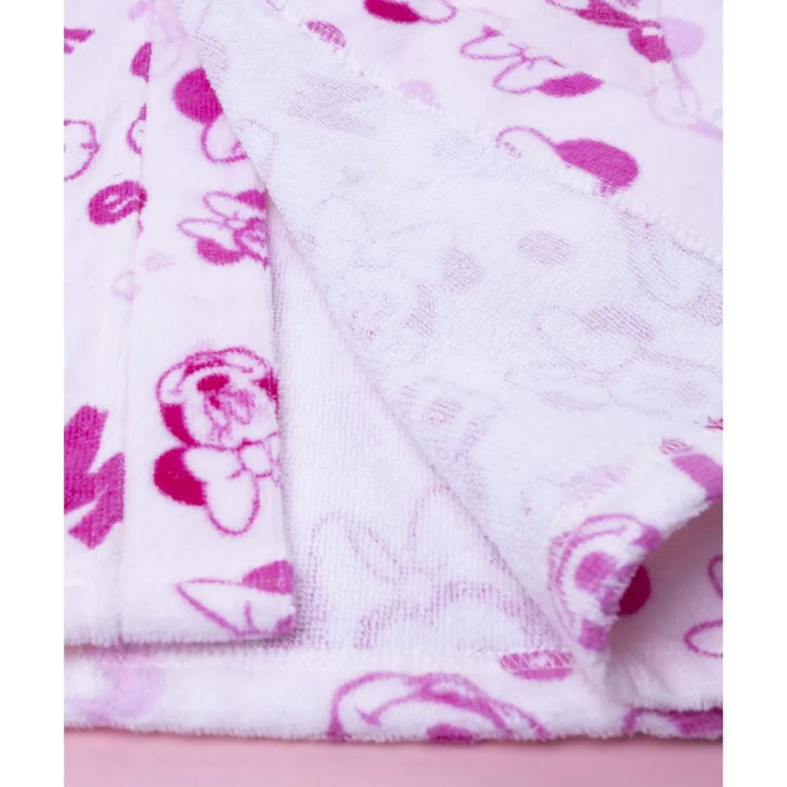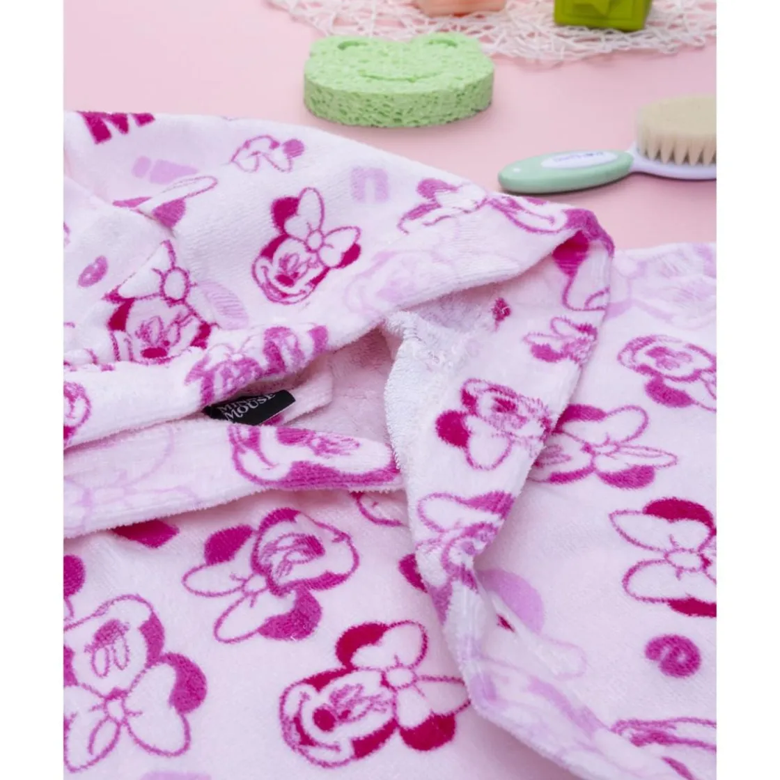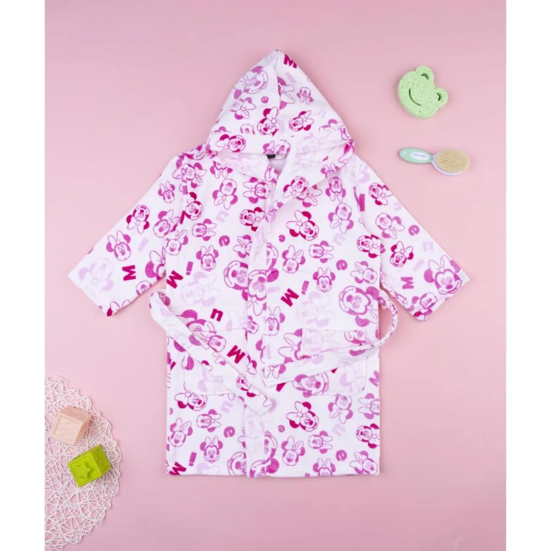 Este albornoz infantil para niña está confeccionado en algodón rizo, aportando suavidad y gran absorción tras el baño. Se presenta en blanco con estampado integral en fucsia de Minnie, capucha y cinturón a juego, ofreciendo comodidad y estilo.