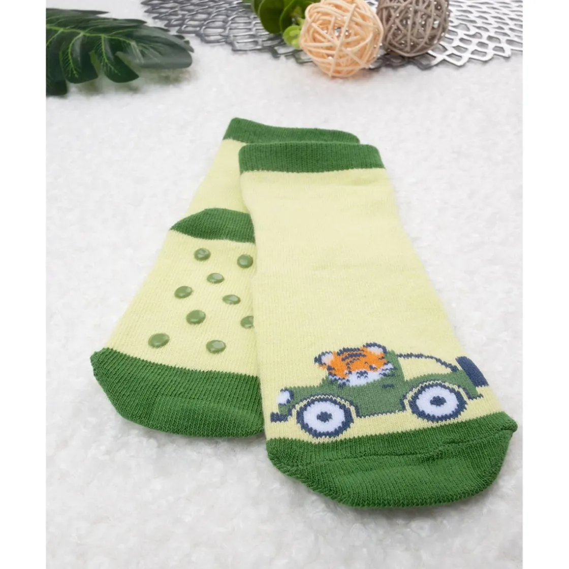 Calcetines antideslizantes de colores para niños. La prenda se desarrolla en varios tonos de verde con estampado de tigre a juego. El ajuste es suave y garantiza cero molestias con gomitas que permiten estabilidad. Accesorios no a la venta. El paquete contiene solo la prenda de vestir