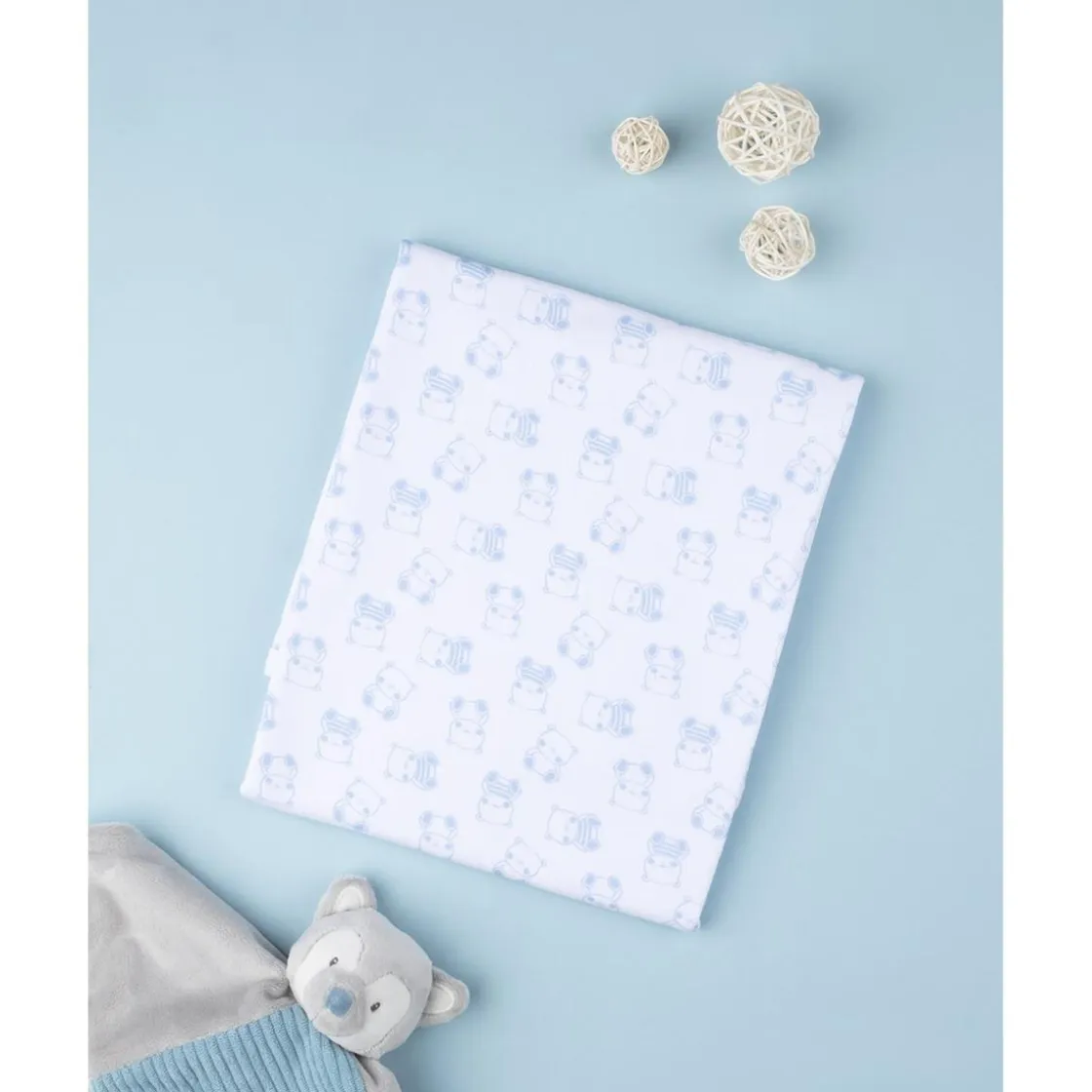 El diseño presenta un adorable estampado de ositos en tono azul claro sobre un fondo crema, aportando un toque tierno.