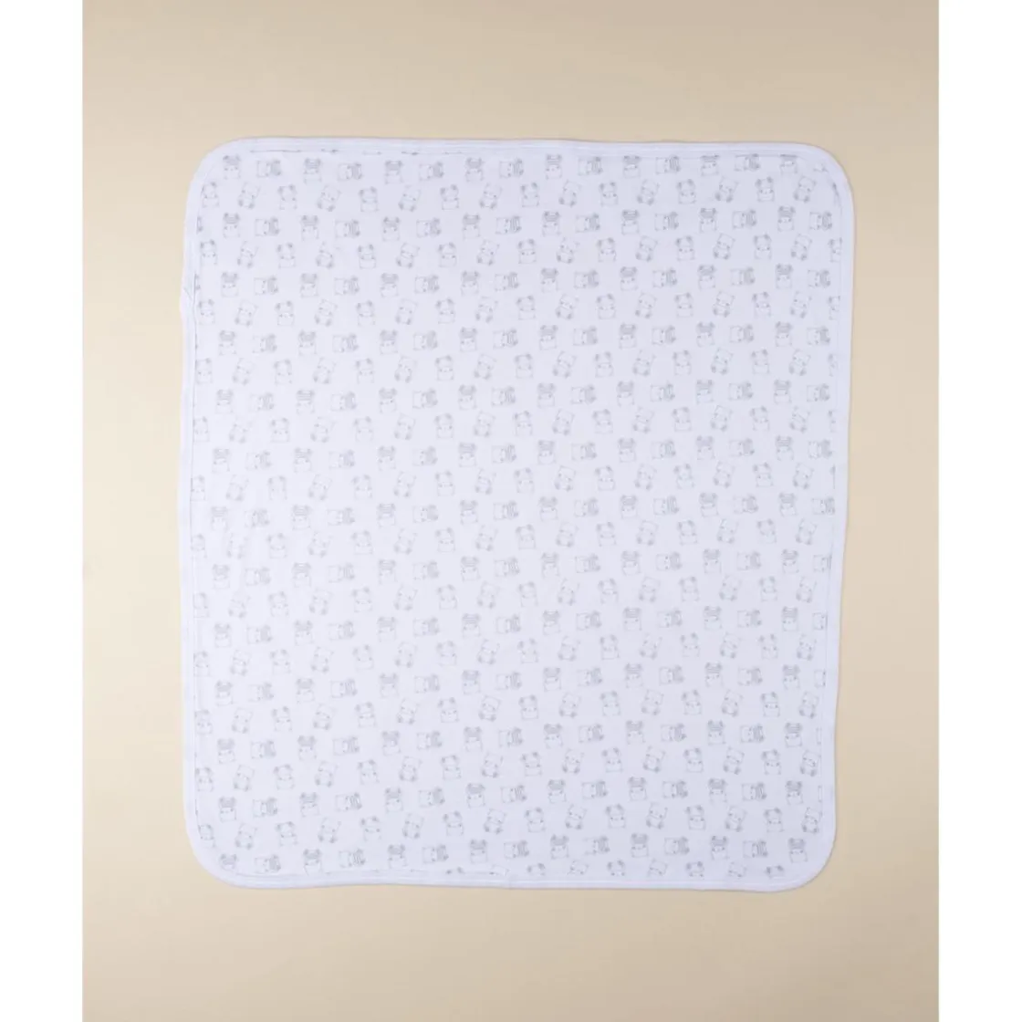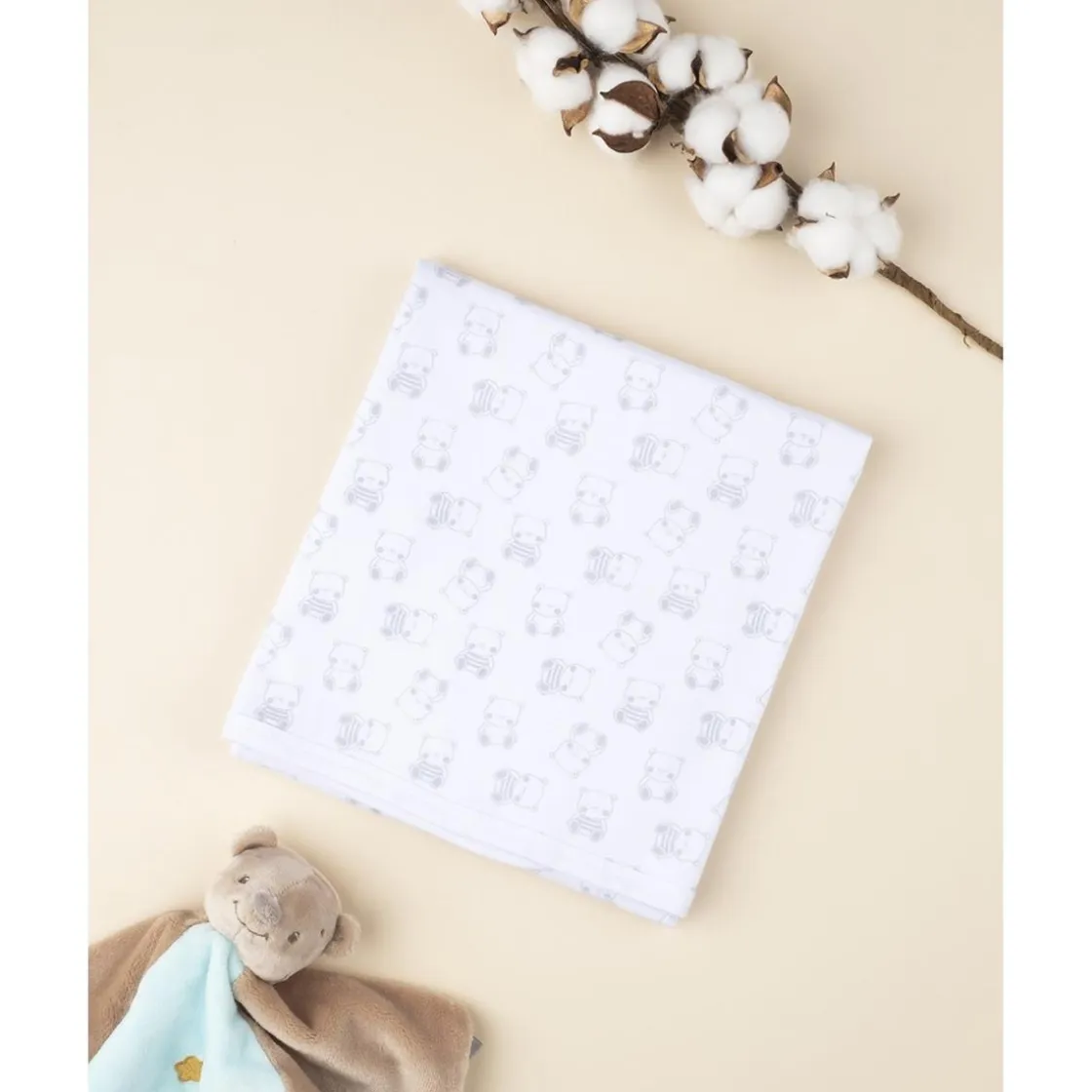 El diseño presenta un adorable estampado de ositos en tonos gris claro sobre un fondo crema, aportando un toque tierno.