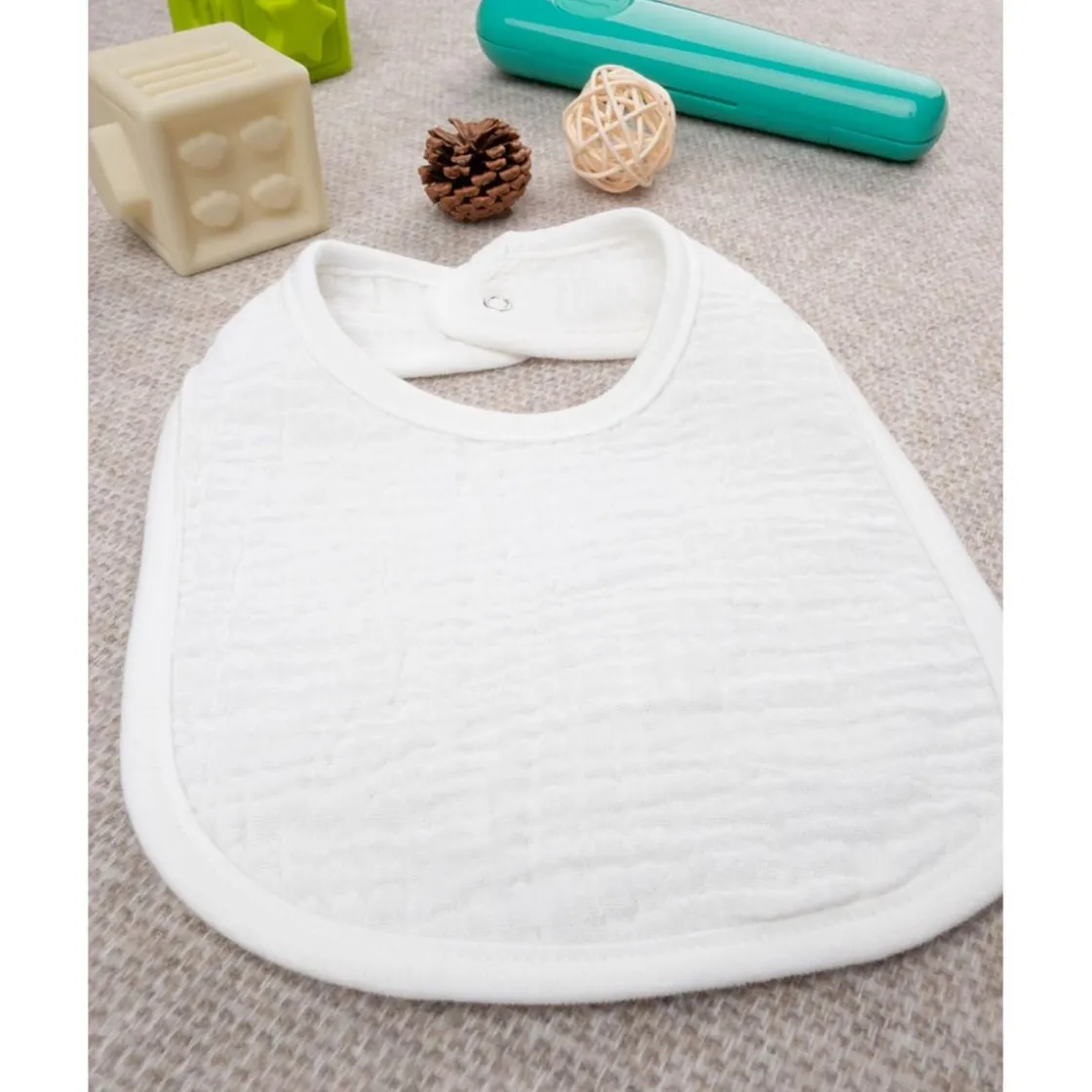 Babero básico de muselina para niño. De color blanco crema con botón automático en el cuello que garantiza practicidad y seguridad. Accesorios no incluidos. La caja contiene solo la prenda de ropa.