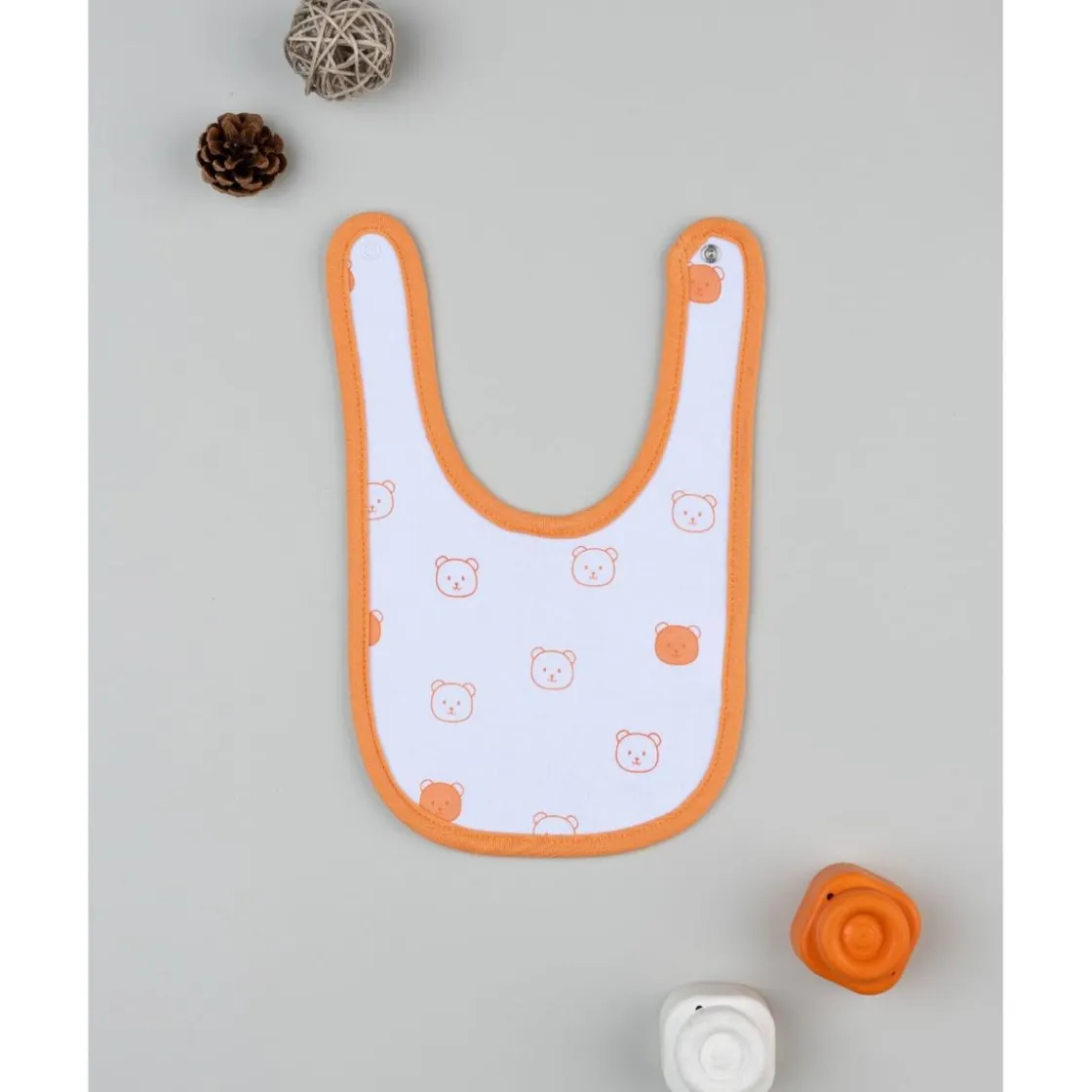 Tierno babero para recién nacido. Se presenta sobre base blanca con un estampado allover de ositos. Borde en color naranja liso a contraste. Cierre con botón a presión en el cuello. Accesorios no incluidos. La caja contiene solo la prenda de ropa.